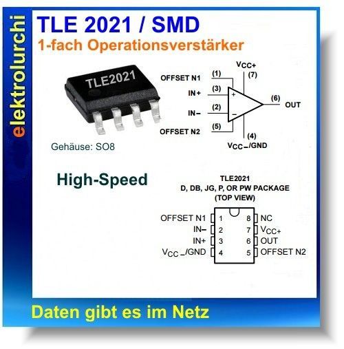 Sie bieten hier auf folgenden Artikel 5 Stück TLE2021C - 1-fach High-Speed- Operationsverstärker, SMD SO8, Texas Instr. Gehäuse: SO8 Hersteller: Texas Instruments