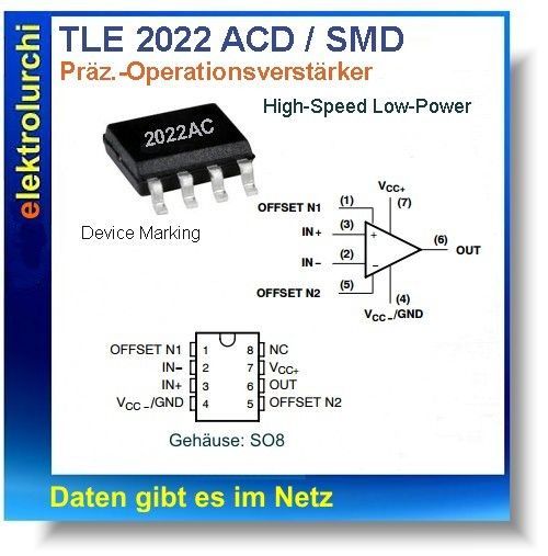 Sie bieten hier auf folgenden Artikel 5 Stück TLE2022 ACD - 1-fach Präzis.- Operationsverstärker, SMD SO8, Texas Instr. Gehäuse: SO8 Hersteller: Texas Instruments