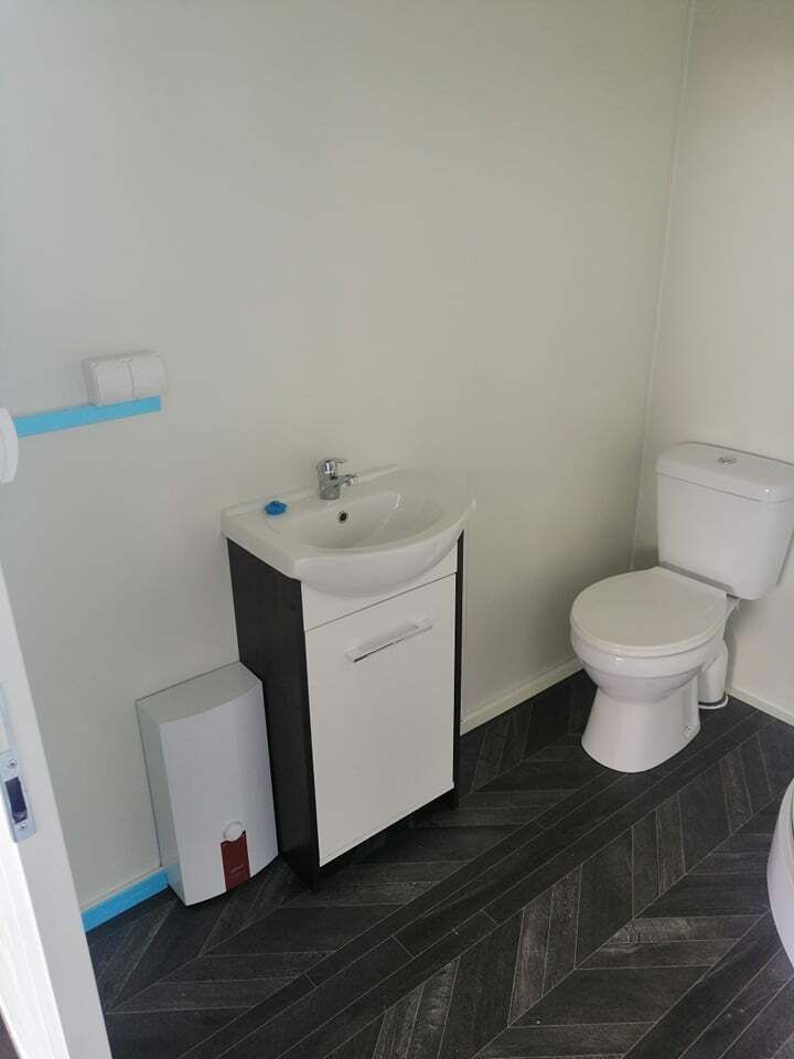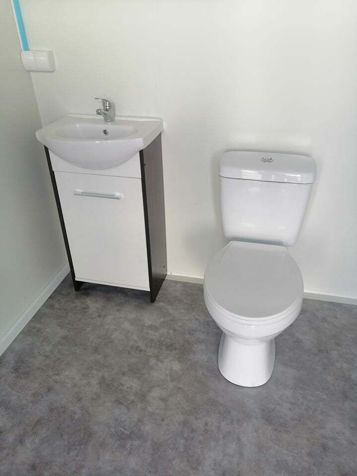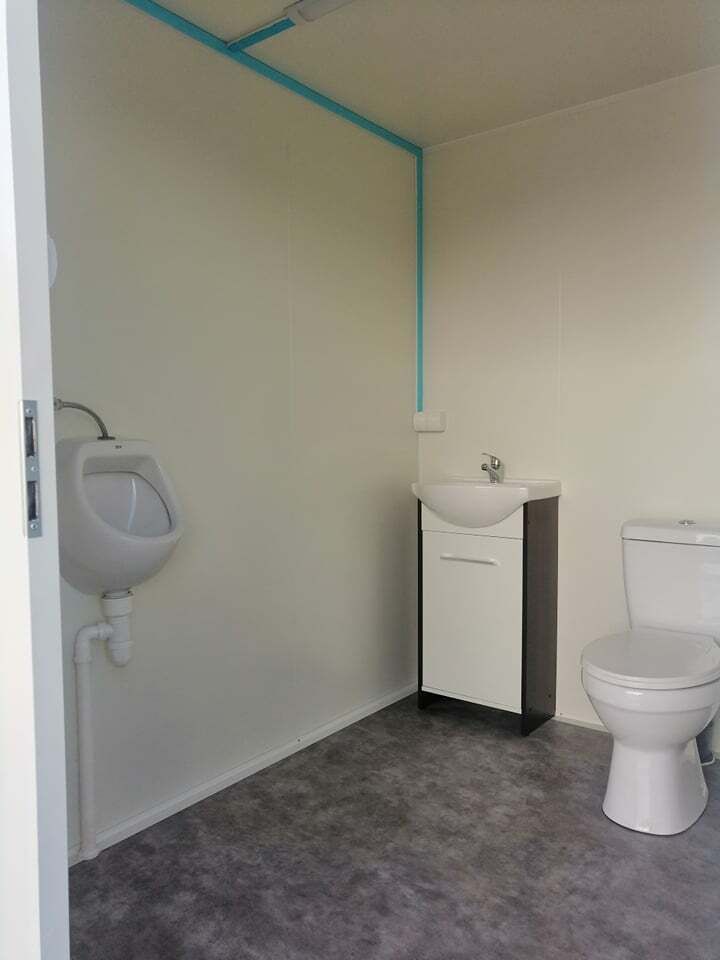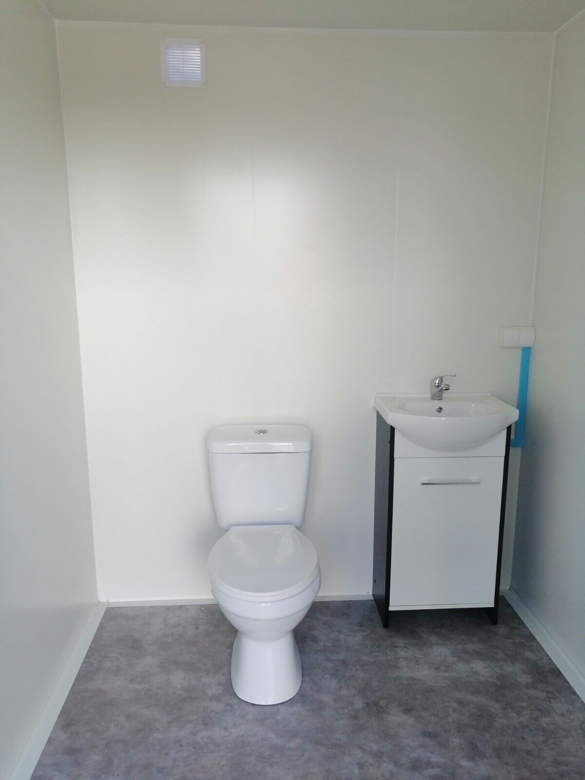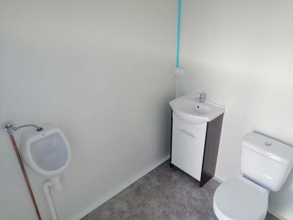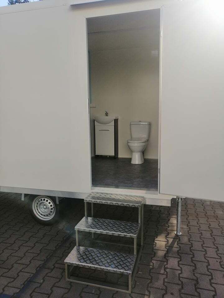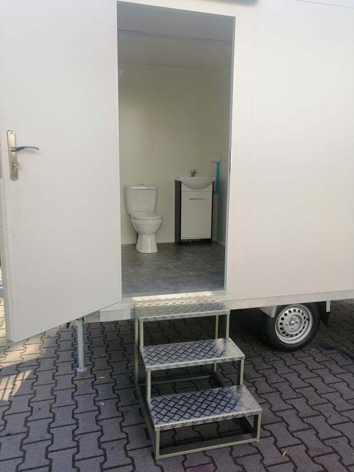 Toilettenanhänger mit - 2 x Toilette - 2 x Waschbecken mit Unterschrank - 1x Urinal - 2 x elektrischer Durchlauferhitzer 230V - Wärmegedämmtes Sandwichprofil für geringen Energieverlust - Komplette Elektroinstallation nach EG Richtlinien - Steckdosen 230V - 2 Deckenlampen - PVC-Bodenbelag - robust u