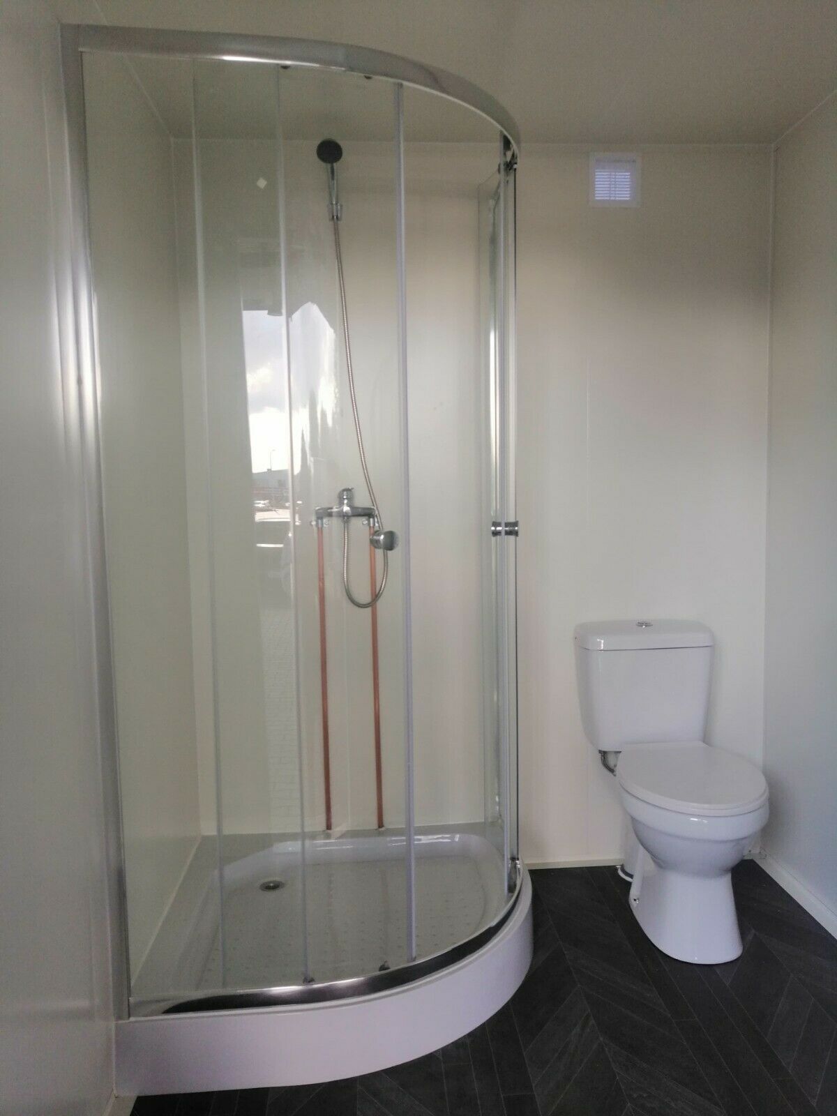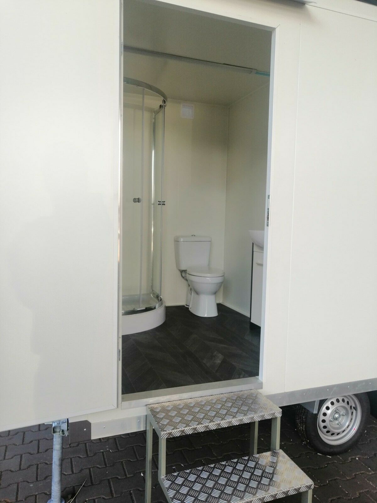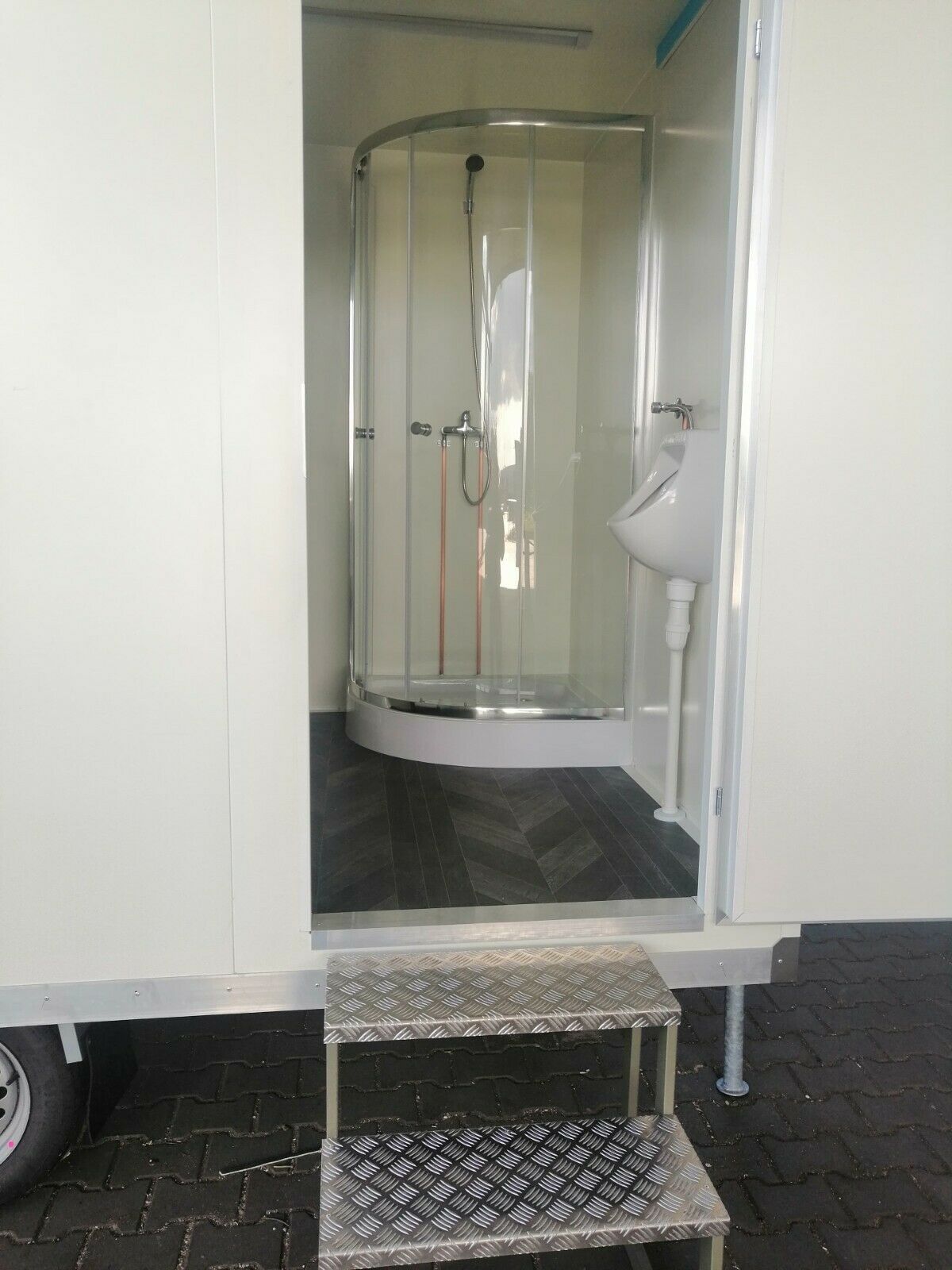 Toiletten- und Duschanhänger mit 2 x Toilette 2 x Waschbecken mit Unterschrank 1x Urinal 2x Dusche - Wände u. Dach Sandwichelemente - elektrischer Durchlauferhitzer 380V - Wärmegedämmtes Sandwichprofil für geringen Energieverlust -2 x verzinkte Hörmann Stahlblech Außentür - Komplette Elektroinstalla