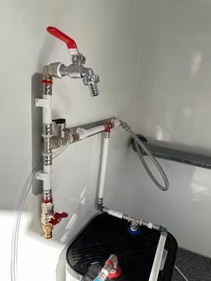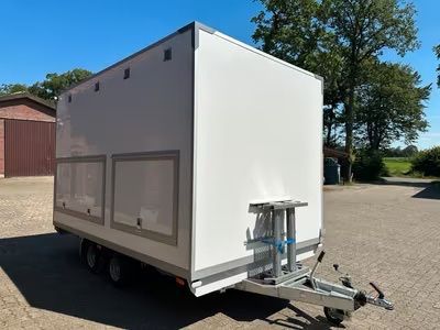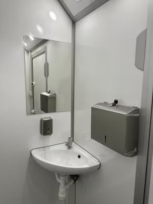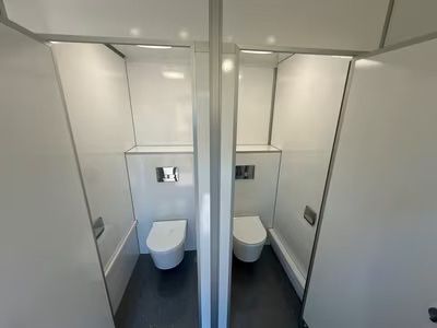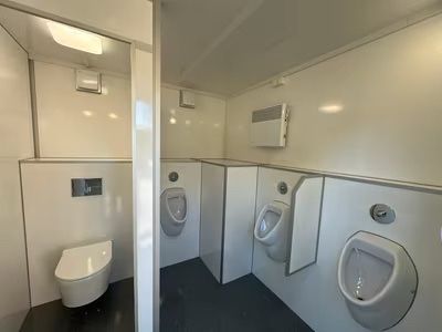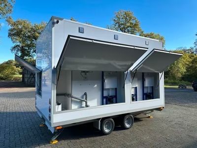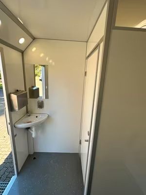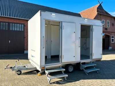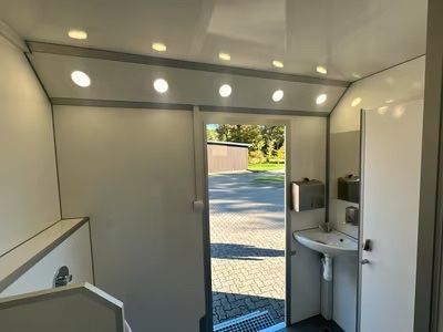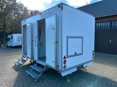 Exklusiver Toilettenwagen 5,20 x 2,40m bestehend aus zwei separat abschließbaren Abteilen. Damenabteil: Waschbecken, 2x Toiletten Herrenabteil: Waschbecken, 1x Toilette + 3x Urinale Beidseitig: Ventilatoren, Heizkörper, Spiegel, Innenbeleuchtung, Papierhalter und Seifenspender. Technisches: - Baujah