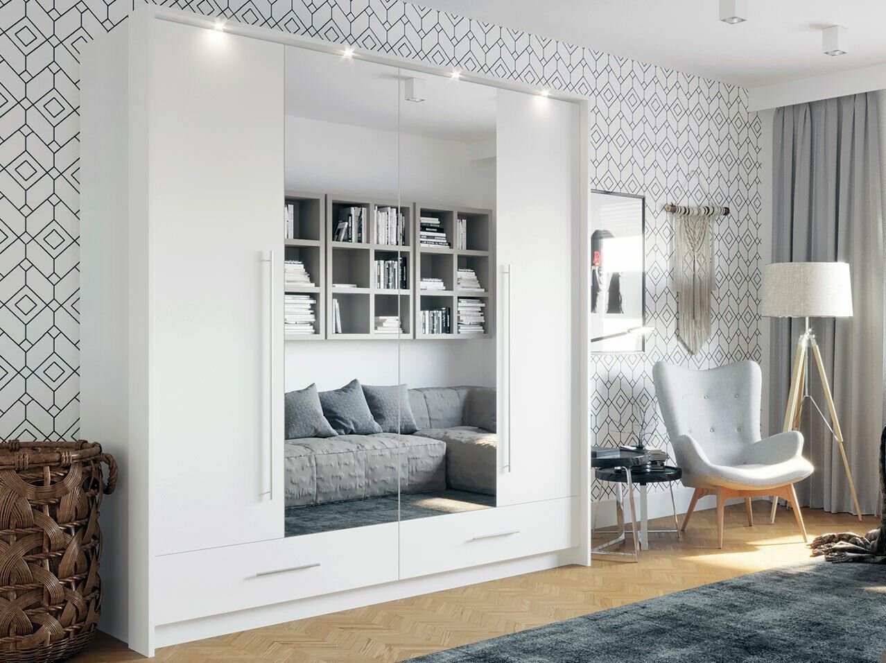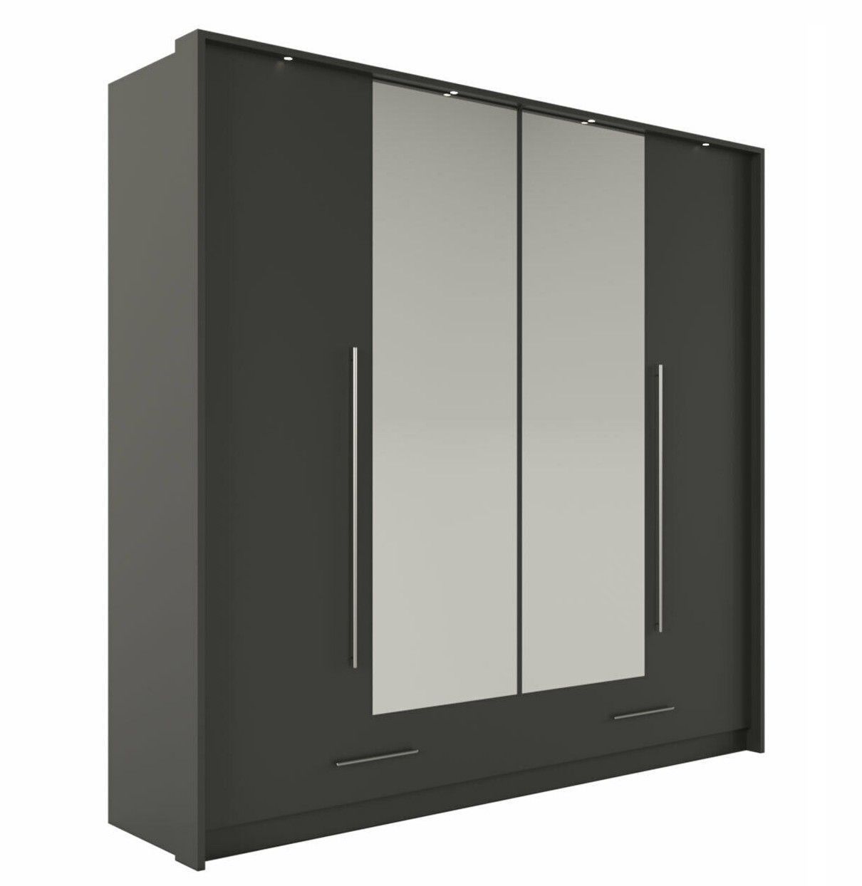 017666076782 Schrank - Tolia SPEZIFIKATION Ma ße: Höhe: 221 cm Breite: 209 cm Tiefe: 67 cm Farb e: Weiß + Spiegel Graphit + Spiegel Produktbeschreibung Der Kleiderschrank aus einer beschichteter Platte. Er hat ein modernes Türöffnungssystem. Hängende Türen auf HETTICH-Beschläg