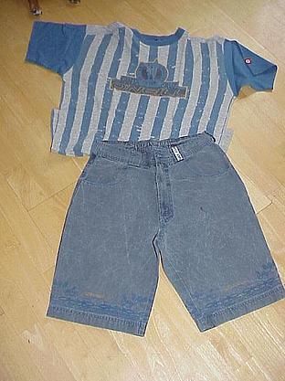 Ganz tolle Kombination von O'Neill in Gr. 176. Jeansblaue Shorts und ein passendes T-Shirt. Getragen, daher Waschspuren aber in Ordnung.