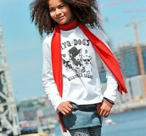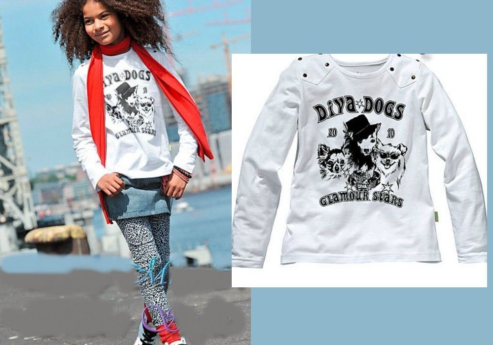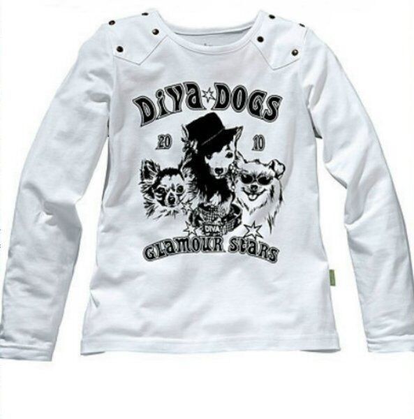 Cooles Girly Langarmshirt mit Rundhalsausschnitt Vorne Schulterpassen die mit Nieten besetzt sind mit stylischem Diva Dogs glamour Stars Print verziert _____________________________ Im Artikel steht Deutsche Größe Größe: 116 122 Material: 100% Baumwolle