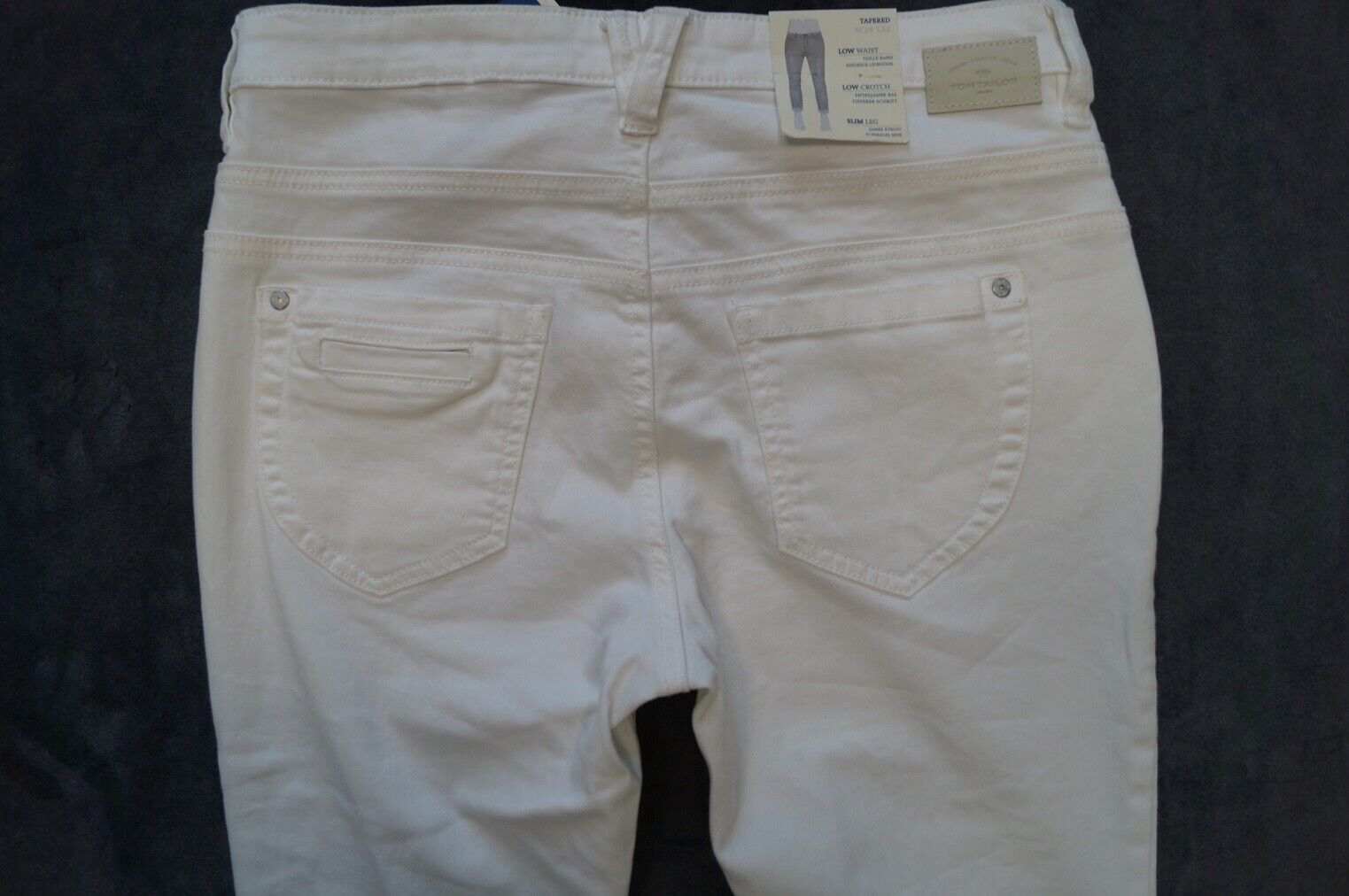 TOM TAILOR TAPERED *Relaxed Tapered * Jeans Ankle Length Crash-Effekt -niedrige Leibhöhe, - tieferer Schritt, - schmales Bein Stretch W28 L32 (Knöchellang) Material: 98%Baumwolle,2%Elasthan Die Hose ist nagelneu und ungetragen, kann aber die Spuren von Staub haben. Farbe: weiß NEU mit Etikett UVP: 6