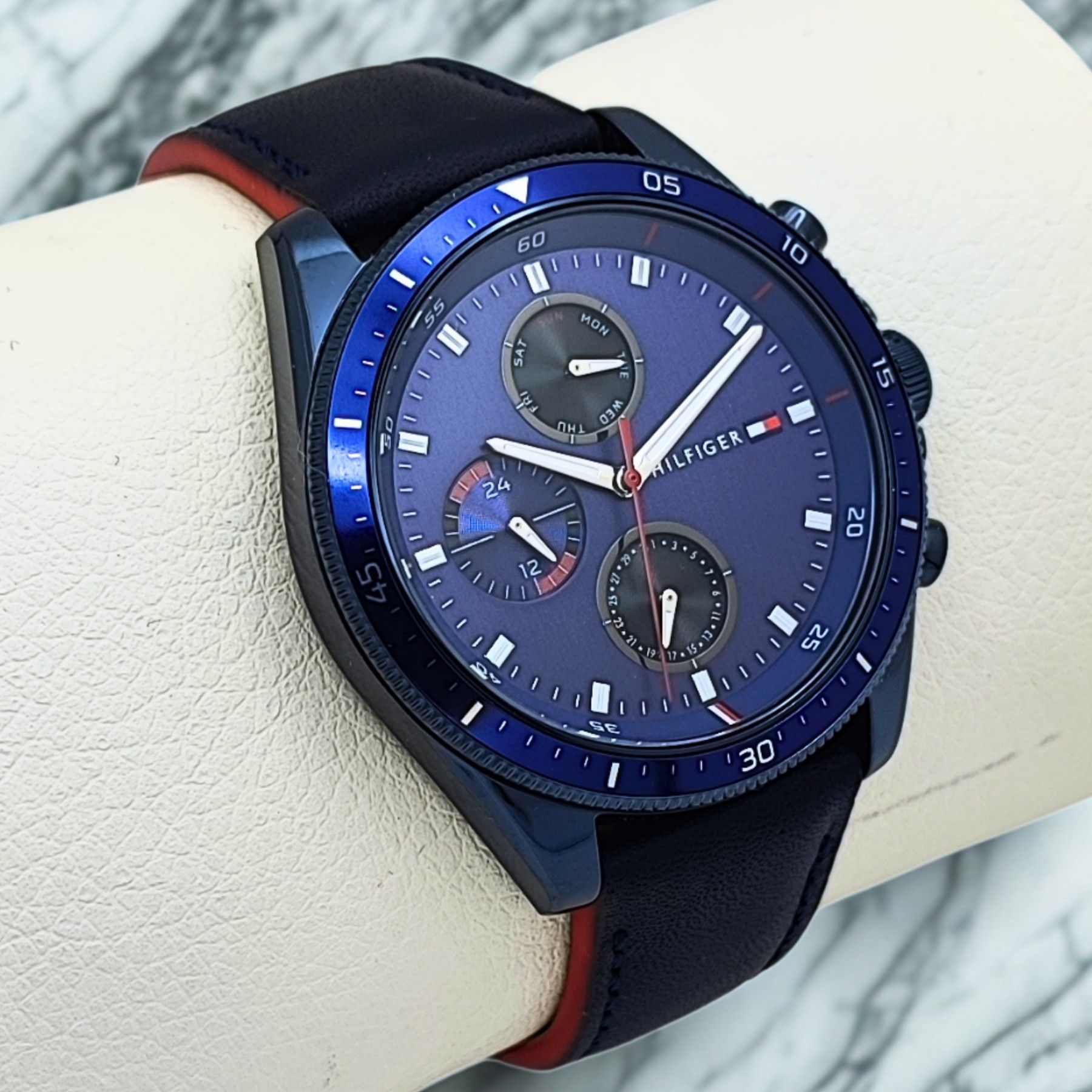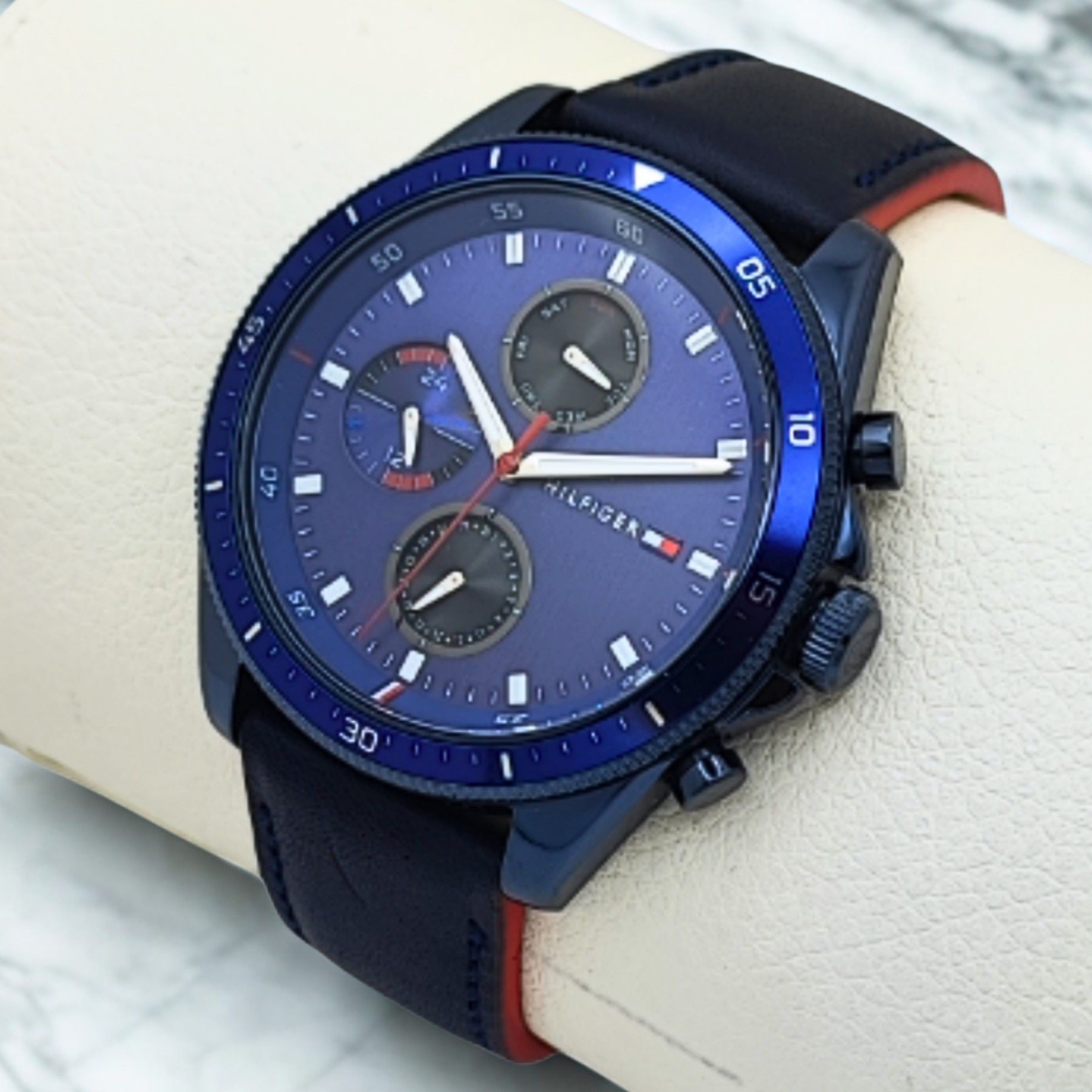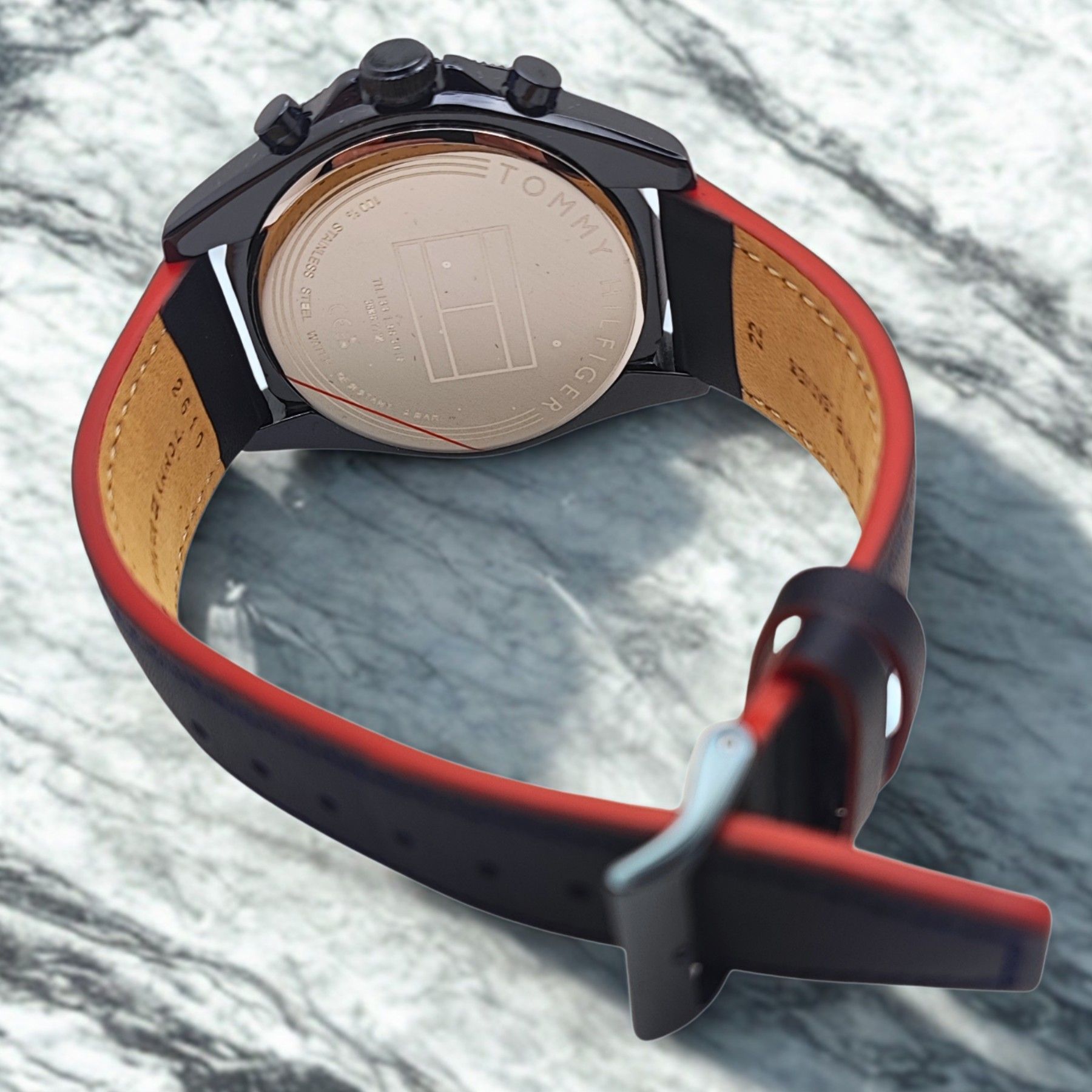 Herrenuhr - Chronograph - Tommy Hilfiger Parker 1791839 – Stil trifft auf Sportlichkeit Die Tommy Hilfiger Parker 1791839 vereint modernes Design mit maskuliner Eleganz. Das dunkelblaue Edelstahlgehäuse und das Lederarmband mit roten Akzenten verleihen der Uhr einen sportlich-klassischen Look. Das s