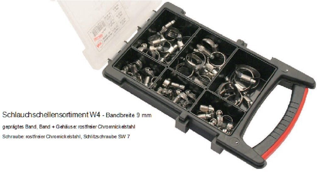 Verteiler: Unser Shop Dieses Angebot umfasst: 1 x Sortimentskasten mit 60 Schlauchschellen W4 komplett Edelstahl RI9 (Bandbreite = 9mm) geprägtes Band DIN 3017 Beispielbild Bandbreite 9mm Schneckenkopf: 7mm mit Schlitz Inhalt des Koffers: 10 Stück 8-12mm 20 Stück 10-16mm 12 Stück 12-22mm 12 ;Stück 1