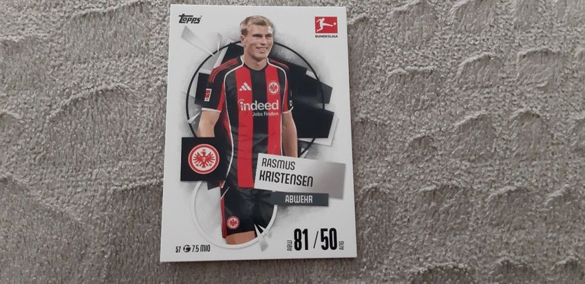 Biete hier 1 Sammelkarte der Serie Topps Match Attax Bundesliga 2025 2026 an . Es handelt sich um die Sammelkarte Nr. 57 Rasmus Kristensen (Eintracht Frankfurt) Die Karte ist neu und wurde nur für das Foto aus der Packung genommen. Den Zustand der Karte entnehmen bitte den Originalfotos. Beim Kauf m