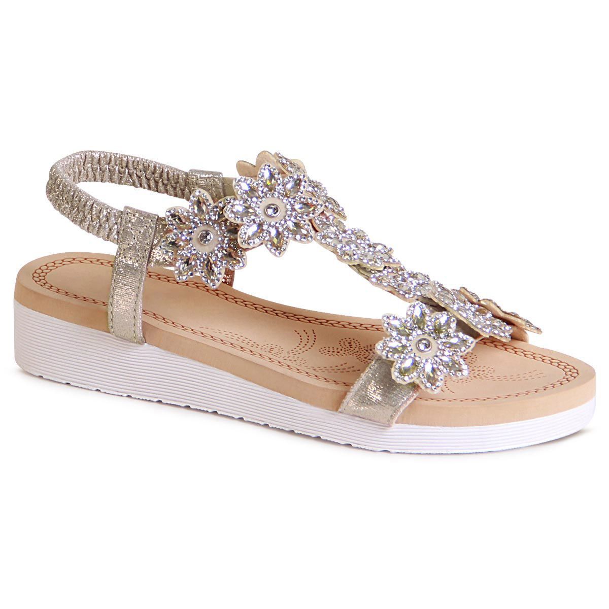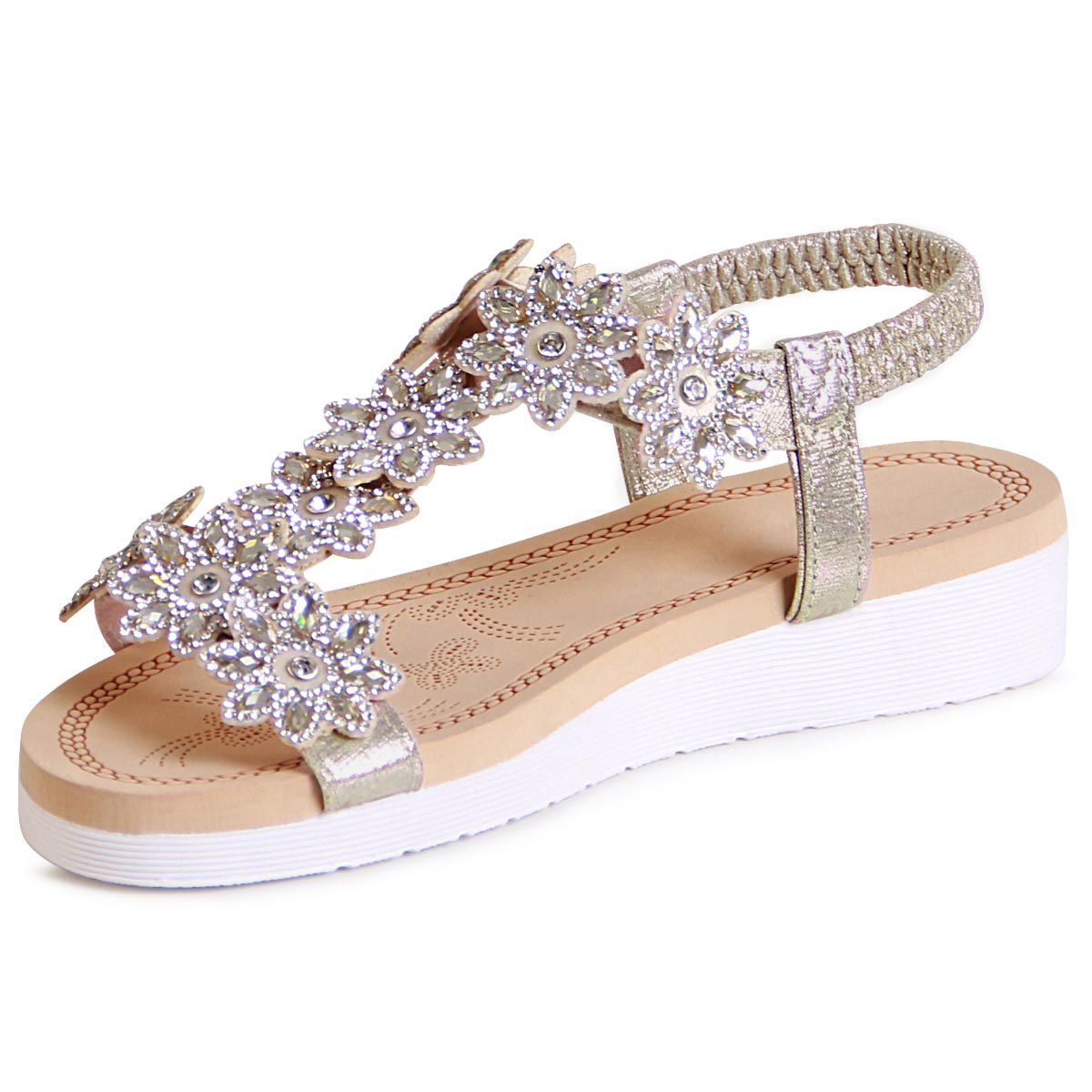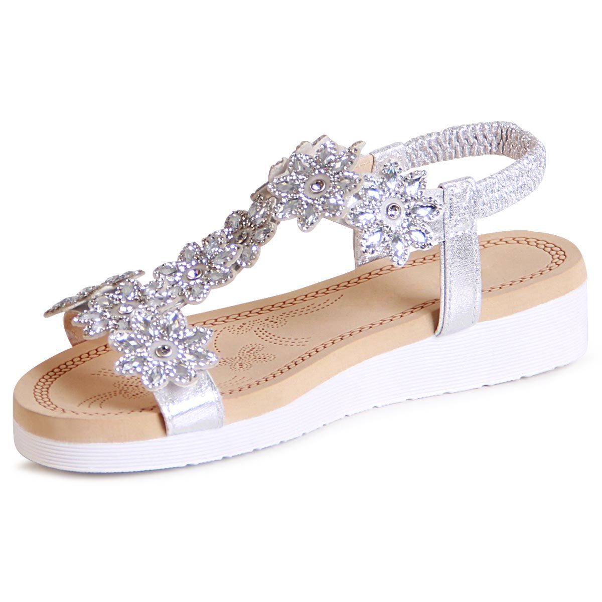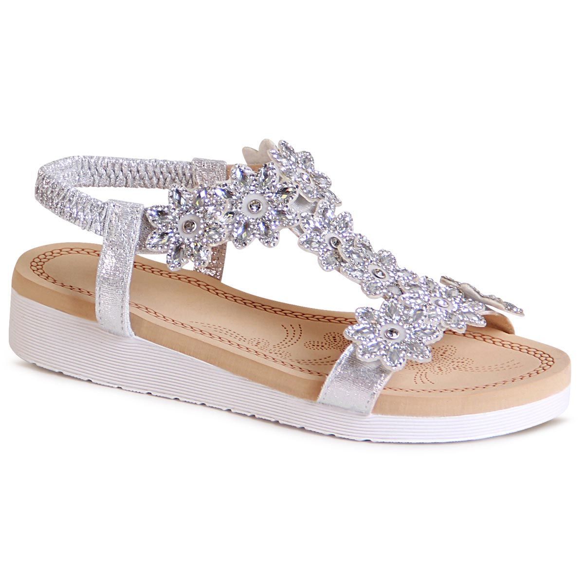 topschuhe24 2394 Damen Keil Sandalen Glitzer Sandaletten Blume