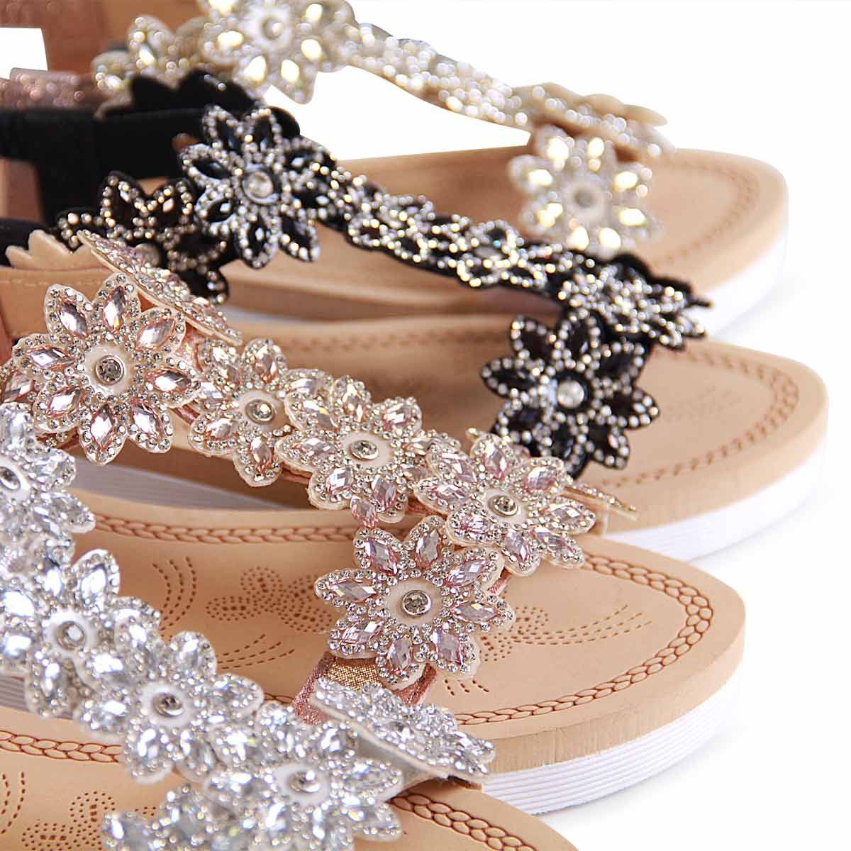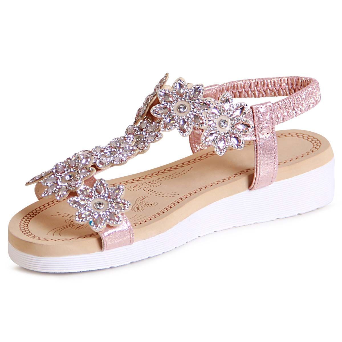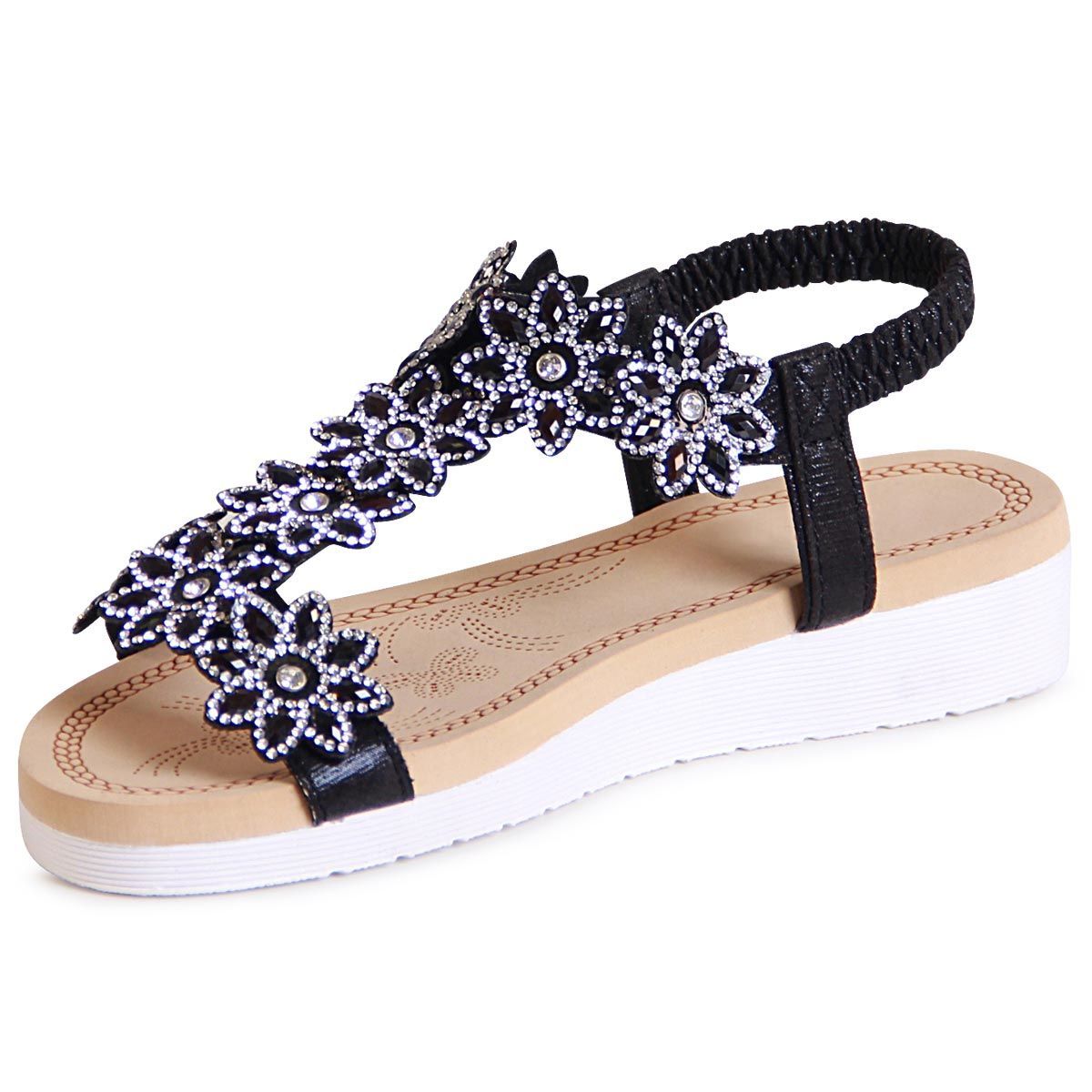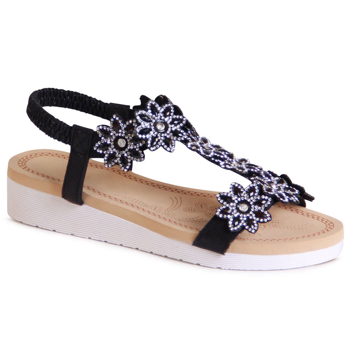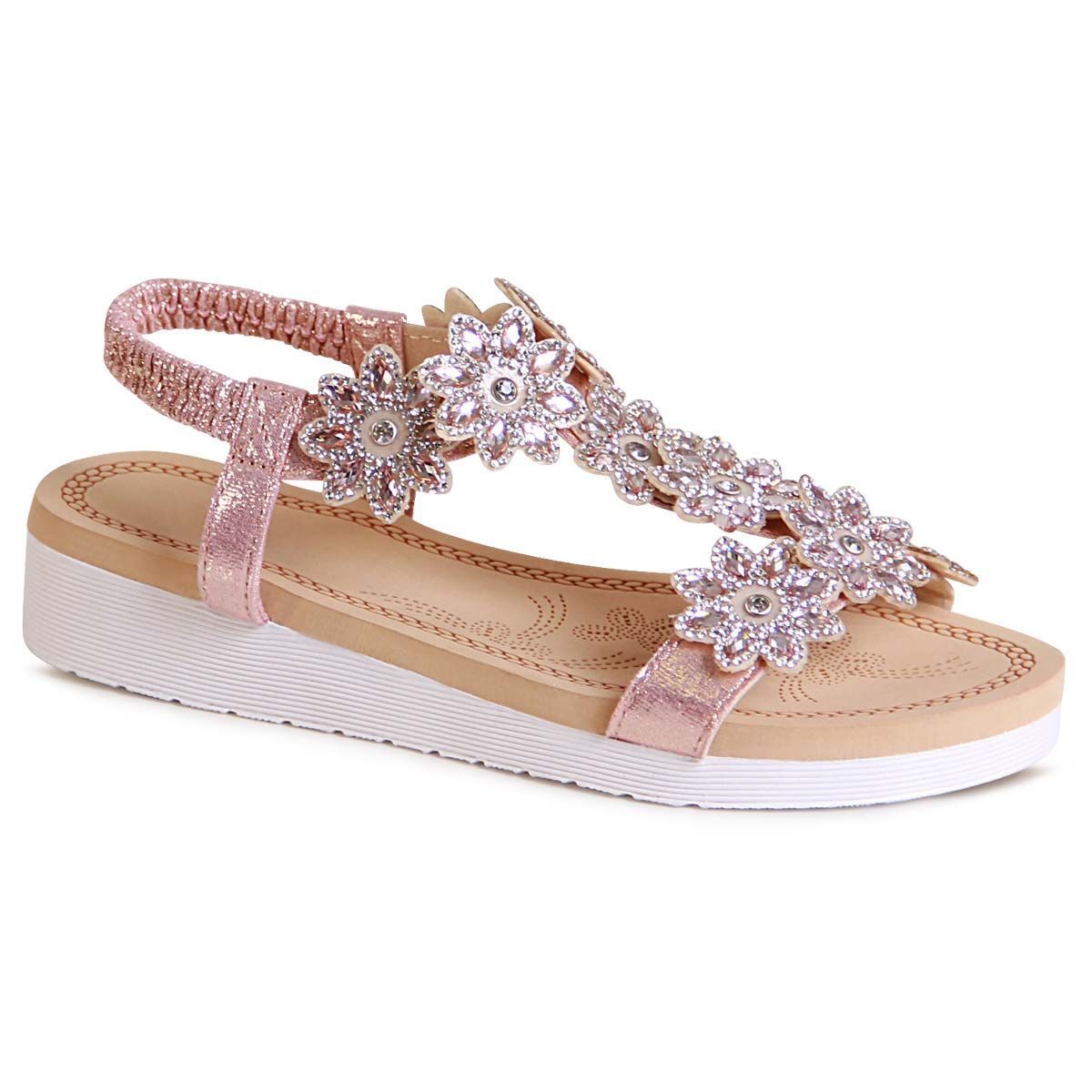 topschuhe24 2394 Damen Keil Sandalen Glitzer Sandaletten Blume