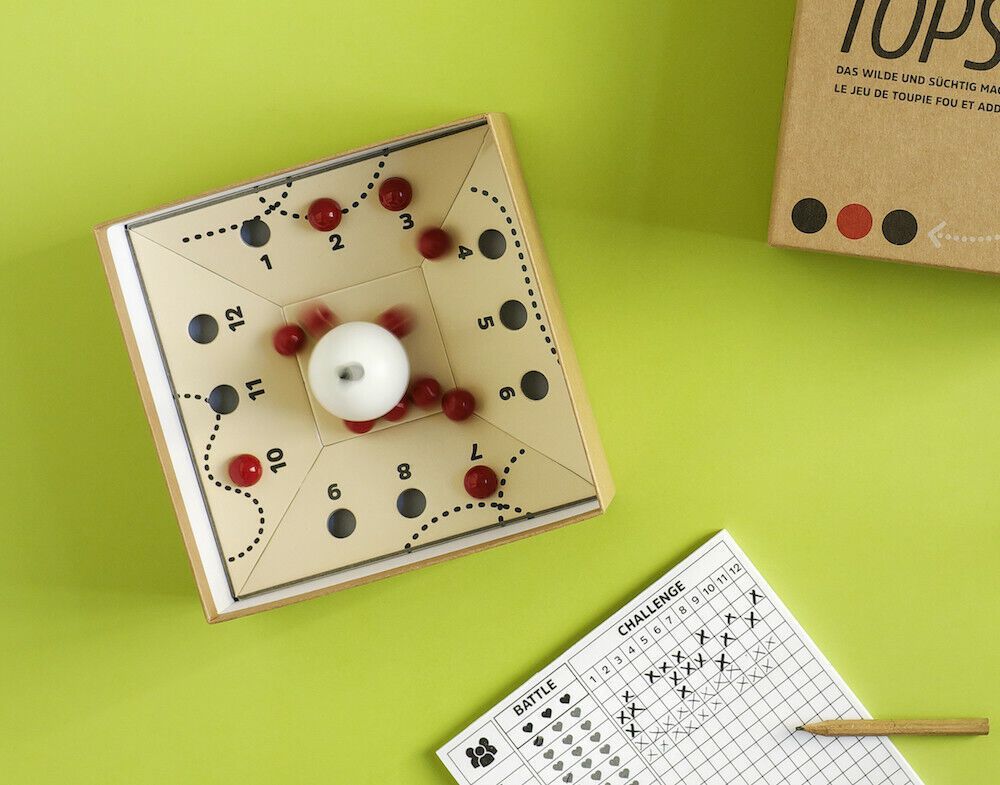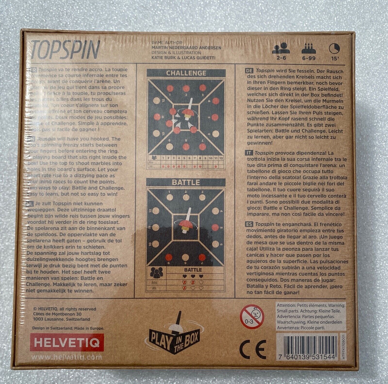 Spieleranzahl: 2 bis 6 Spieldauer: 15 Minuten Altersempfehlung: 8+ TOPSPIN - Das wilde und süchtig machende Kreiselspiel Topspin wird dich fesseln. Der Kreisel nimmt seinen Lauf zwischen deinen Fingern bevor er die Arena erobert. Die Schachtel ist auch gleich das Spielbrett! Mit Hilfe des Kreisels s