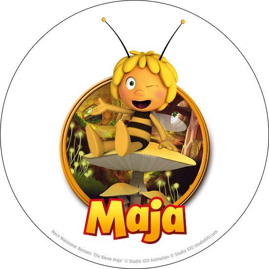 Lustiger Tortenaufleger Biene Maja auf Pilz Die fröhliche Biene Maja und Ihre Freunde werden nach wie vor von jung und alt geliebt. Zaubern Sie eine lustige Torte mit unserem Tortenaufleger Biene Maja auf Pilz ! Sie bekommen ein essbares Tortenbild in optimaler Qualität auf Dekor-Plus Zuckerpapier g