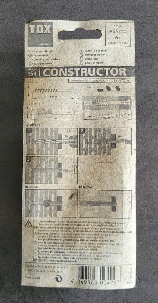 ACHTUNG: Originalverpackung ist leicht beschädigt! TOX 6x Allzweck-Rahmendübel Constructor 6 x 70 mm + galvanisch verzinkte Schraube mit Senkkopf und TX-Antrieb , 022702101 Verknotet oder spreizt automatisch Hält in fast allen Baustoffen Gleichmäßige Kraftverteilung... Mehr