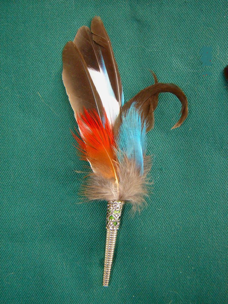 Hutschmuck , Hutfeder klassischer Hutschmuck für Trachtenhut Vereinshut , Schützenhut oder auch für den Wanderhut , Herrenhut Trachtenhut Federgesteck mit Hülse schöne bunte Hutfeder filigraner Halter mit Nadel zum Anstecken Gesamthöhe insgesamt ca 12,5 cm Natürlich werden keine Federn oder Haare vo