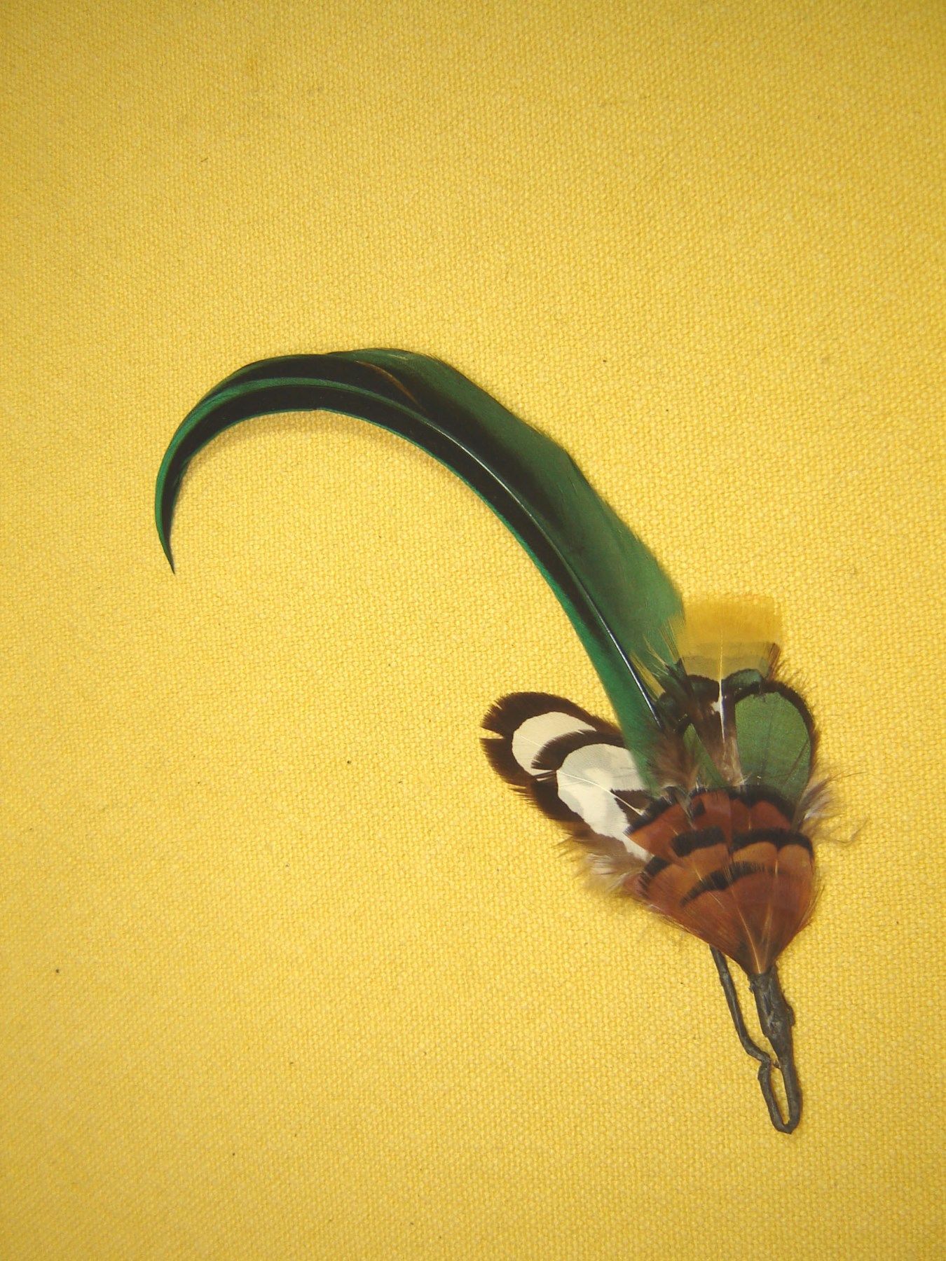 . Musikantenfeder Schützenfeder Hutfeder 1 fach nach links gebogen klassische Hutfeder für Tracht als Reiherersatz braun weiß gestreifte Feder , grün gefärbt mit bunten Federn reine Federlänge ist ca 16 cm auf Wunsch auch mit Halter , H362III 6,- Euro Natürlich werden keine Federn oder Haare von Tie