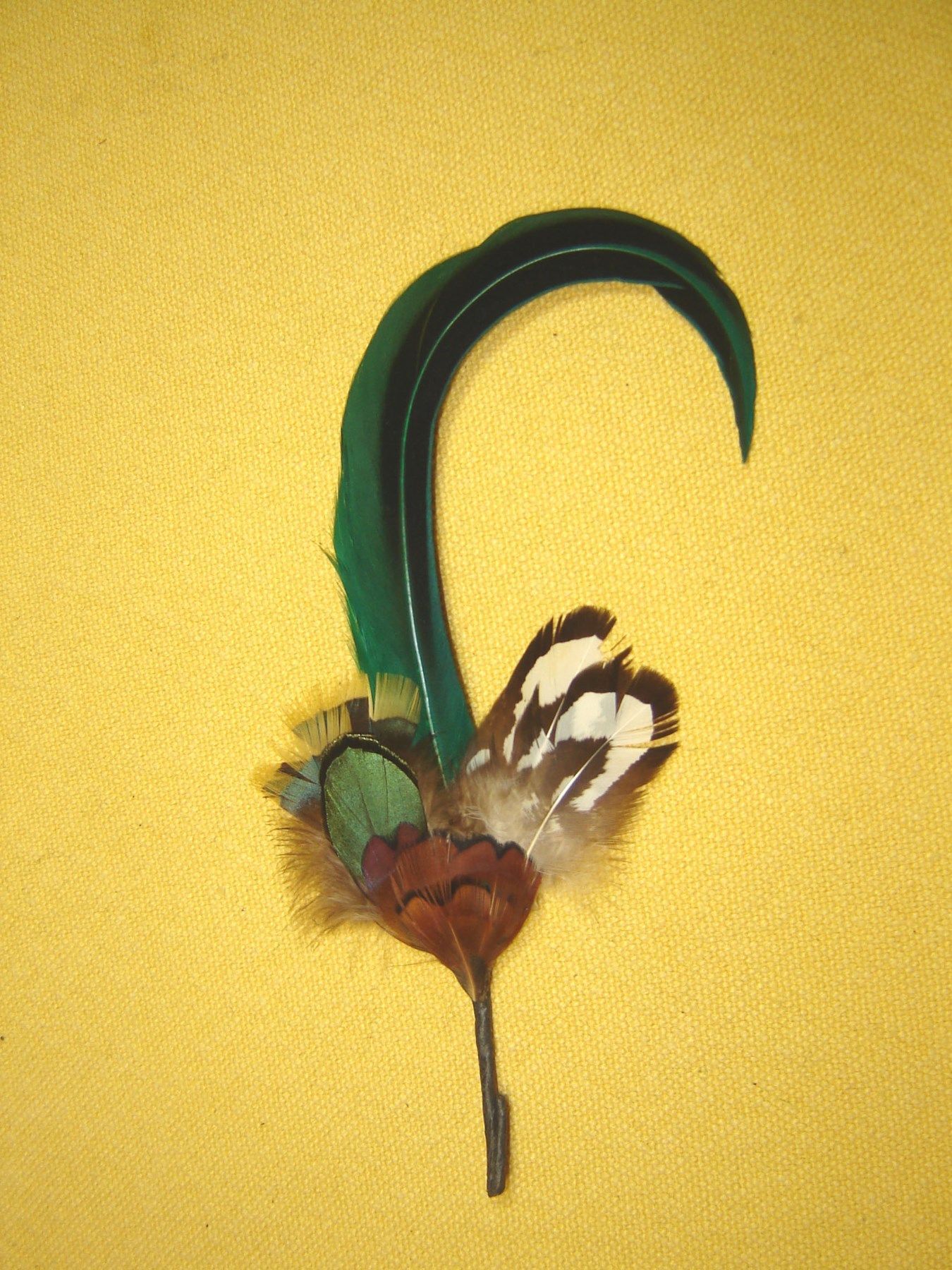 . Musikantenfeder Schützenfeder Hutfeder 1 fach nach rechts gebogen klassische Hutfeder für Tracht als Reiherersatz braun weiß gestreifte Feder , grün gefärbt mit bunten Federn reine Federlänge ist ca 16 cm auf Wunsch auch mit Halter , H362III 6,- Euro Natürlich werden keine Federn oder Haare von Ti