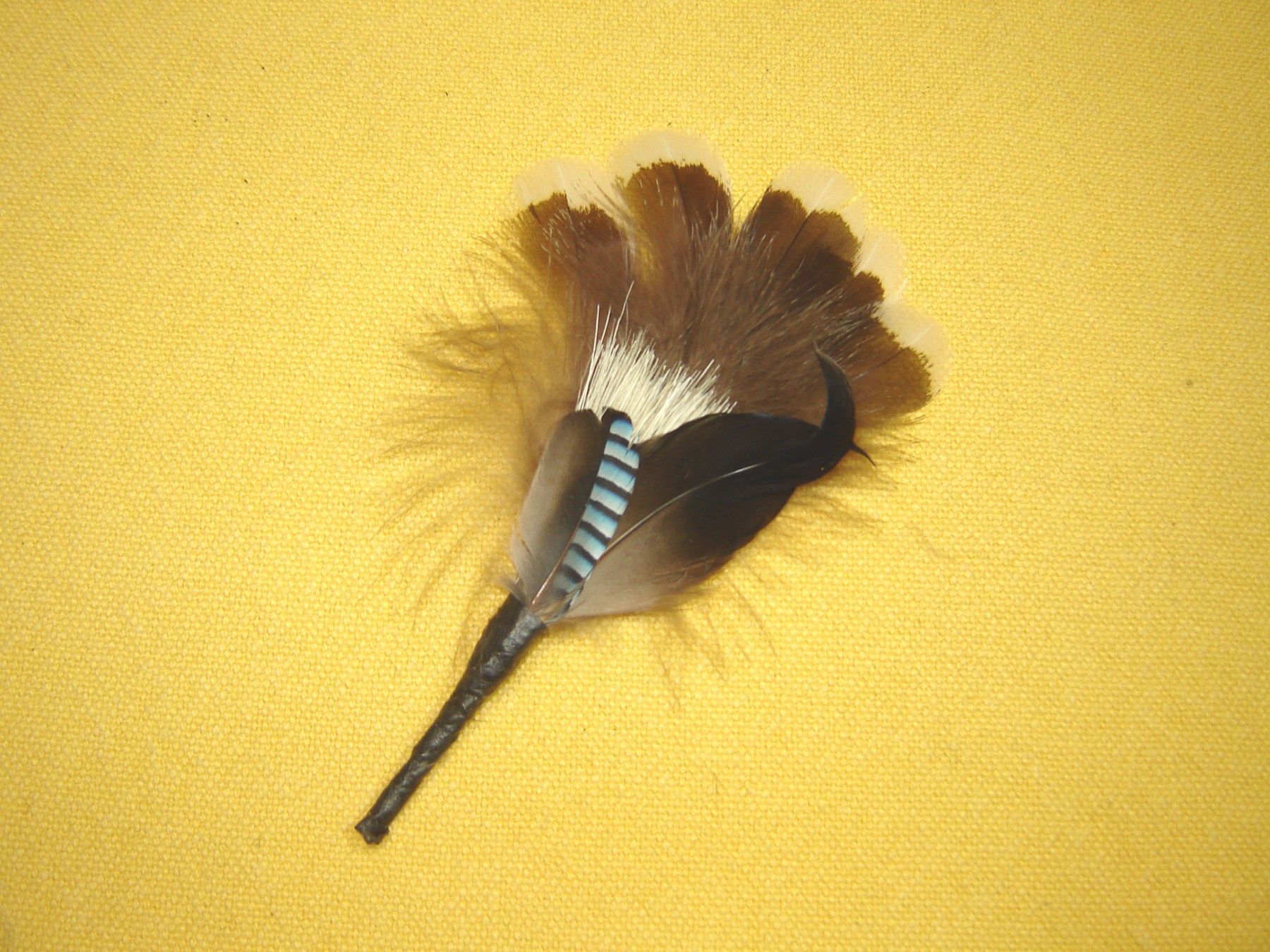 . klassische Hutfeder für den Trachtenhut echte Spielhahn Seitenfeder, das was bei den großen Stößen übrig bleibt mit kleinem Dachsbart Eichelhäher und Entenhakl auf Wunsch auch mit Halter , H362III 6,- Euro Feder Länge ca 13 cm Natürlich werden keine Federn oder Haare von Tieren verwendet , die unt