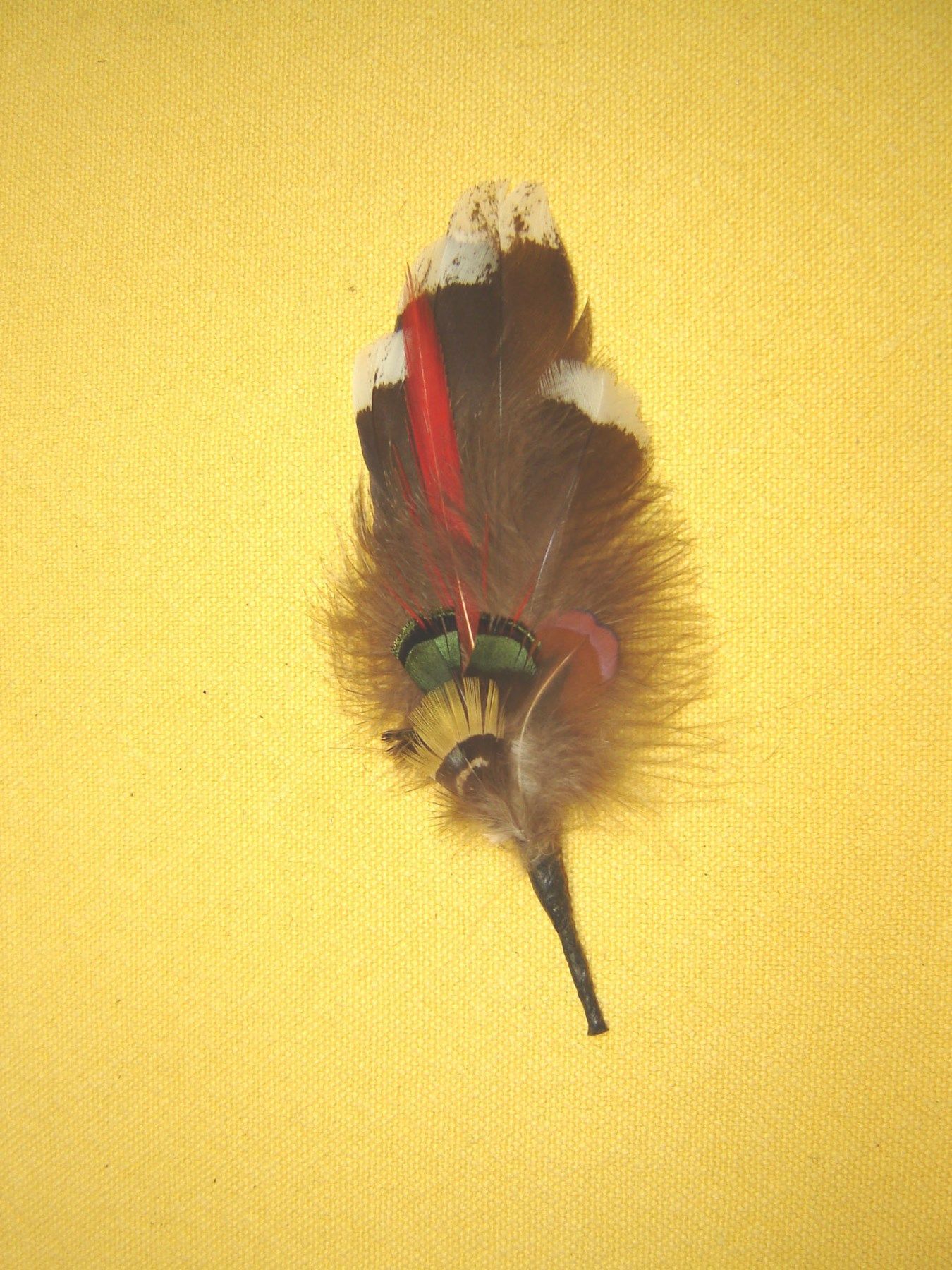 . klassische Hutfeder für den Trachtenhut echte Spielhahn Seitenfeder, das was bei den großen Stößen übrig bleibt mit rotem Fasanspiess und gelb grünem Abschluß auf Wunsch auch mit Halter , H362III 6,- Euro Feder Länge ca 14 cm Natürlich werden keine Federn oder Haare von Tieren verwendet , die unte
