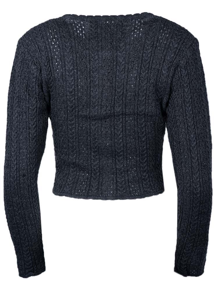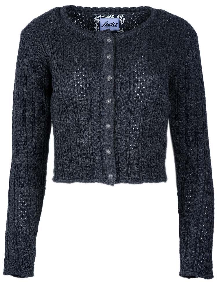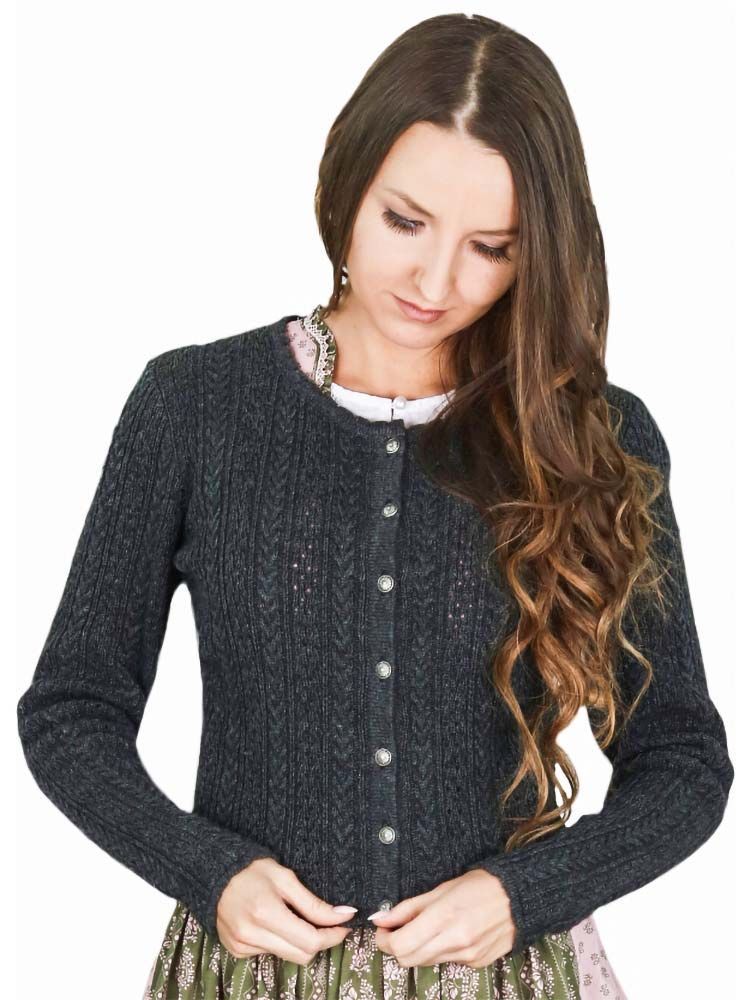 Trachtenjacke Fabienne aus Strick grau Die Strickjacke hat ein süßes Zopfmuster und wird durch traditionelle Knöpfe geschlossen. Das Material ist eine hochwertige Mischung aus 50% Wolle und 50% Polyamid.