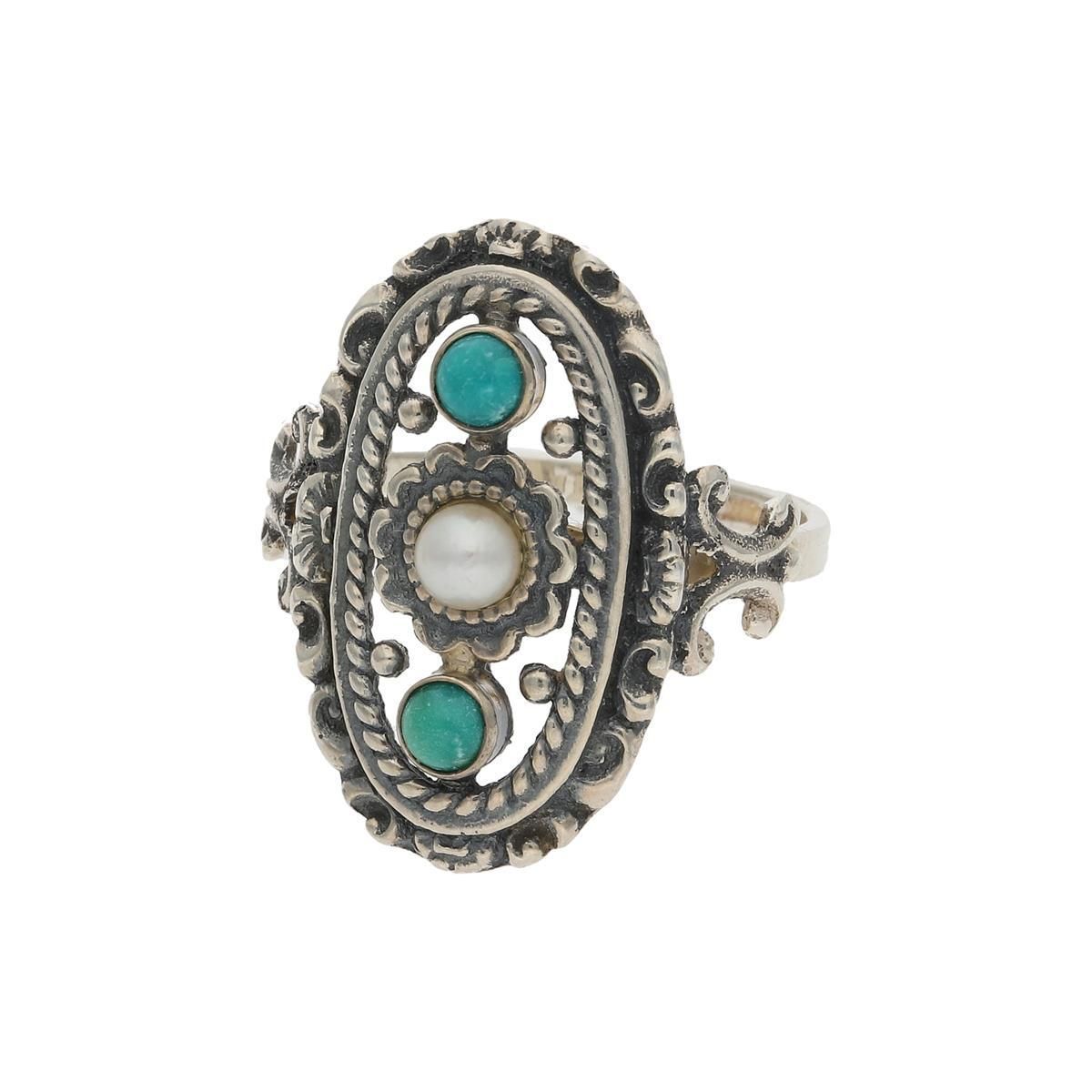 Trachtenring Silber 835 geschwärzt, Türkis, Süßwasser Zuchtperle Second Hand 25320548