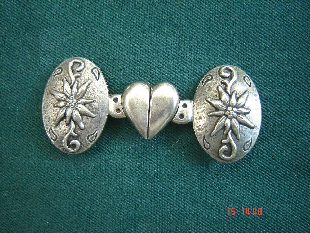 . verzierte Schließe für Dirndlschürze oder Trachtengürtel kompakte Schürzenschließe mit Herz und Edelweiß Höhe ca 3 cm , Breite ca 4 cm cm je Teil , zusammen ca 6,7cm die Schürzenschließe wird wie ein Knopf angenäht ausgezeichnete Verarbeitung , aus deutscher Herstellung . Bitte Sehen Sie sich hier