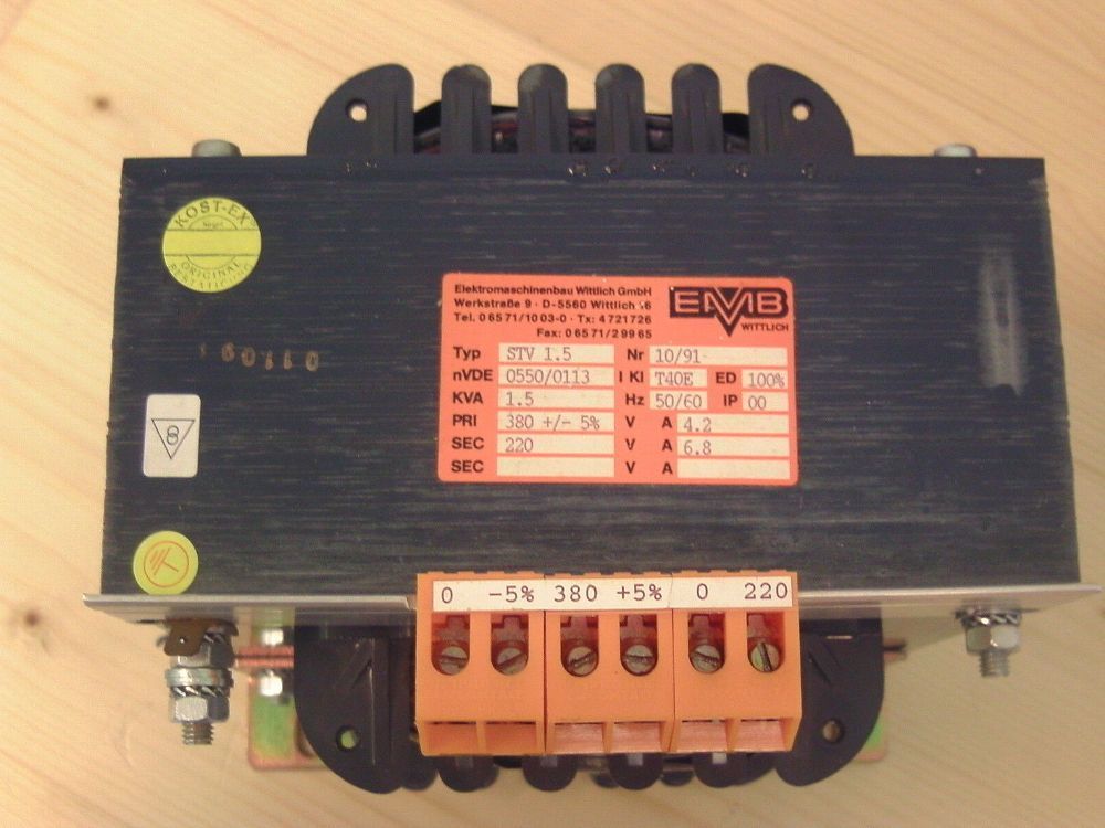 Trafo EMB STV 1,5 Nr 10/91 pri. 380 V 2 Phasen sek. 1x220 V 6,8 A Trenntrafo T9/534