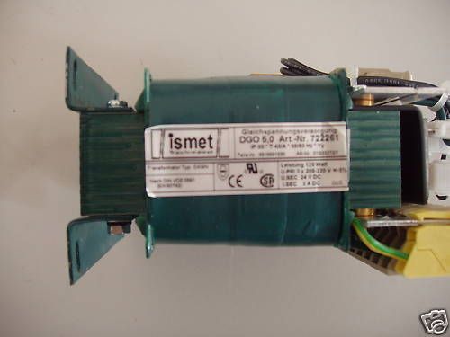 KOST-EX Elektrofachhandel Bestellnummer T10 33 Trafo ISMET DGO 5,0 Prim. 231, 220, 218, 209, 208, 198 V Sekundär 24 V DC 5A 120 W Gewicht: 2,98 kg Maße LxBxH: 100x70x130 mm VDE 0551 Sicherheits-, Funktionsprüfung und Isolationsmessung nach VDE durchgeführt Der Trafo ist gebraucht, Top-Zustand. Unser