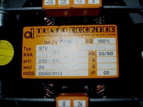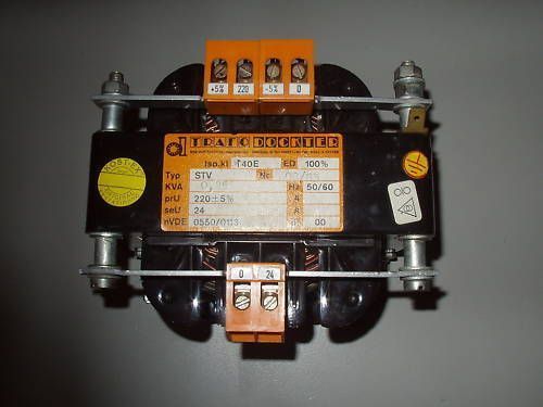 KOST-EX Elektrofachhandel Bestellnummer T9 458 Transformator Dockter STV 0,25 kVA Primär 220 V + - 5 % Sekundär: 24 V Gewicht: 4,34 kg Maße LxBxH: 130x90x120 mm Sicherheits-, Funktionsprüfung und Isolationsmessung nach VDE durchgeführt Der Trafo ist gebraucht und in einem Top - Zustand. Unsere Artik