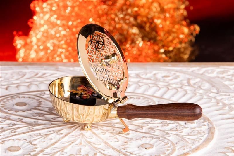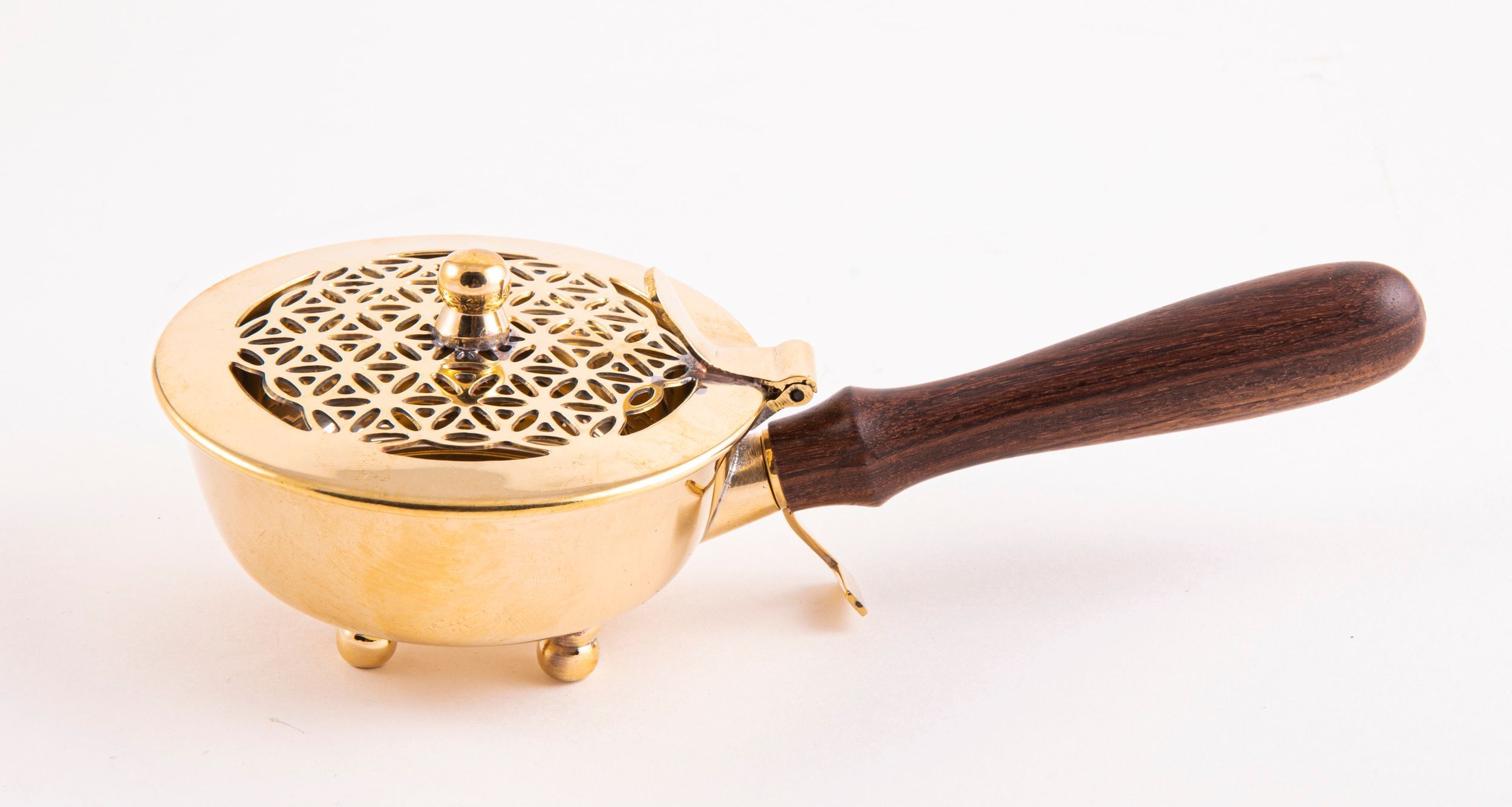 Tragegefäß BLUME DES LEBENS Messing mit Holzgriff L 20 cm ø 9 cm Räuchergefäß