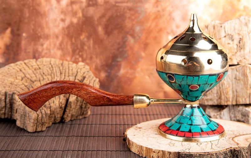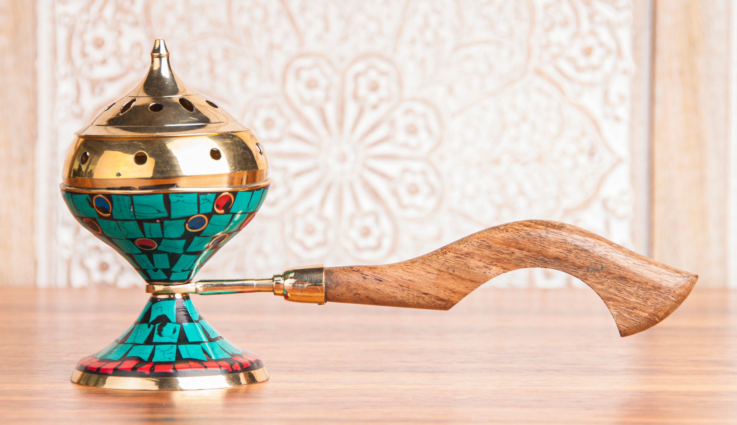 Tragegefäß SELENA mit Steinen Messing mit Holzgriff L 24 cm H 13 cm Räuchergefäß
