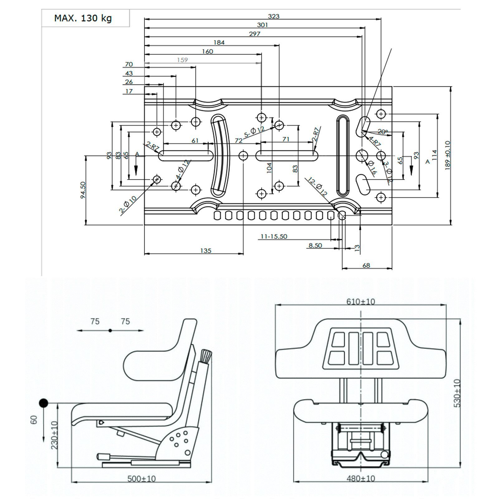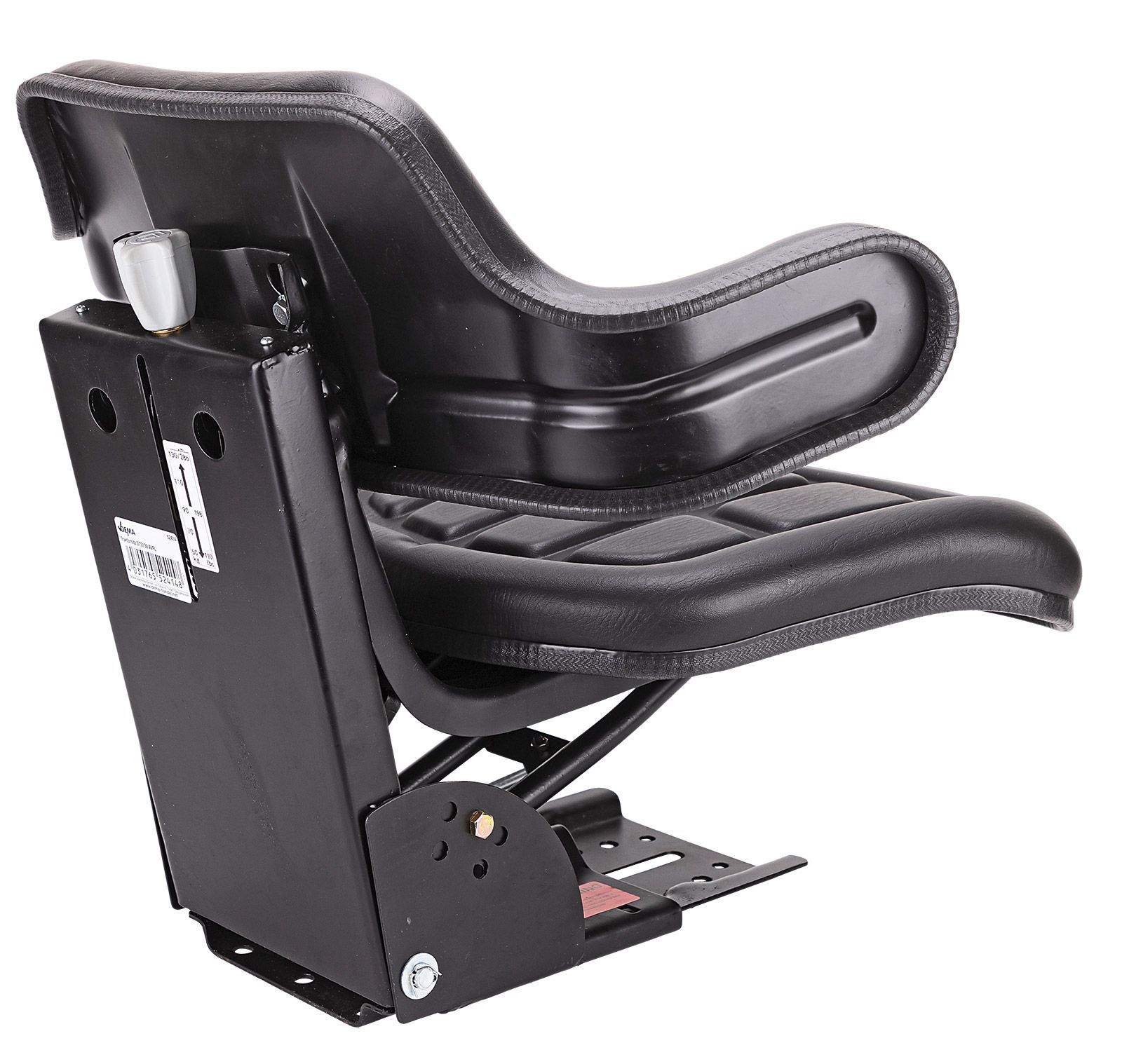 Traktorsitz / Schleppersitz schwarz mit Armlehne DTS130 AVFL Der DEMA Traktorsitz DTS130 AVFL ist die ideale Sitzlösung für Traktoren und Baumaschinen. Dieser Einsteigersitz mit integrierter Armlehne sorgt für eine ergonomische Sitzhaltung und bietet hohen Komfort bei der Arbeit. Dank seiner umfangreichen Befestigungsmöglichkeiten ist der Sitz auf unterschiedlichsten Fahrzeugtypen mit geraden oder schrägen Konsolen montierbar. Ob für Ford, John Deere, Fendt oder andere Marken – dieser Traktorsitz verbindet Sicherheit und Bequemlichkeit. Produktmerkmale: Universelle Befestigung: Für gerade und schräge Konsolen geeignetHochwertige Materialien: Kunstlederbezug mit PU-Schaum-InnenmaterialErgonomisches Design: Stufenlose Gewichtseinstellung und zentrale Verstellung der Sitzlehne und SitzauflageStabil und langlebig: Stahlkern-Trägerkonstruktion mit öldruckgedämpftem FederwegFlexibilität: 5-fache Konsolen-Neigungsverstellung bis zu 40° Technische Daten: Längsverstellung: 14 cmFederweg: 60 mm, öldruckgedämpftSitzfläche: 48 x 34 cm (BxT)Rückenlehne mit Armlehne: 61 x 29 cm (BxH)Gewichtseinstellung: 50 - 130 kg, stufenlosBefestigungsplatte: 33,5 x 14 cm (LxB)Gesamtabmessungen: 61 x 50 x 51 cm (BxTxH)Gewicht: 13,99 kg Der DEMA Traktorsitz DTS130 AVFL bietet eine optimale Kombination aus Komfort, Sicherheit und Stabilität. Perfekt für lange Arbeitstage in der Landwirtschaft oder auf der Baustelle – dieser Sitz garantiert eine ergonomische Haltung und eine einfache Anpassung an Ihre Bedürfnisse.