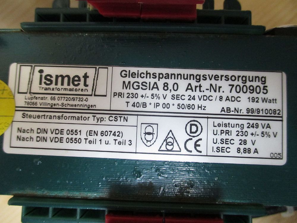 KOST-EX Elektrofachhandel Bestellnummer T 9 788 Ismet Transformator CSTN MGSIA 8,0 Trafo Gleichspannungsversorgung 249 VA pri. 230 V + - 5% sec. 28 V DC sec. 8