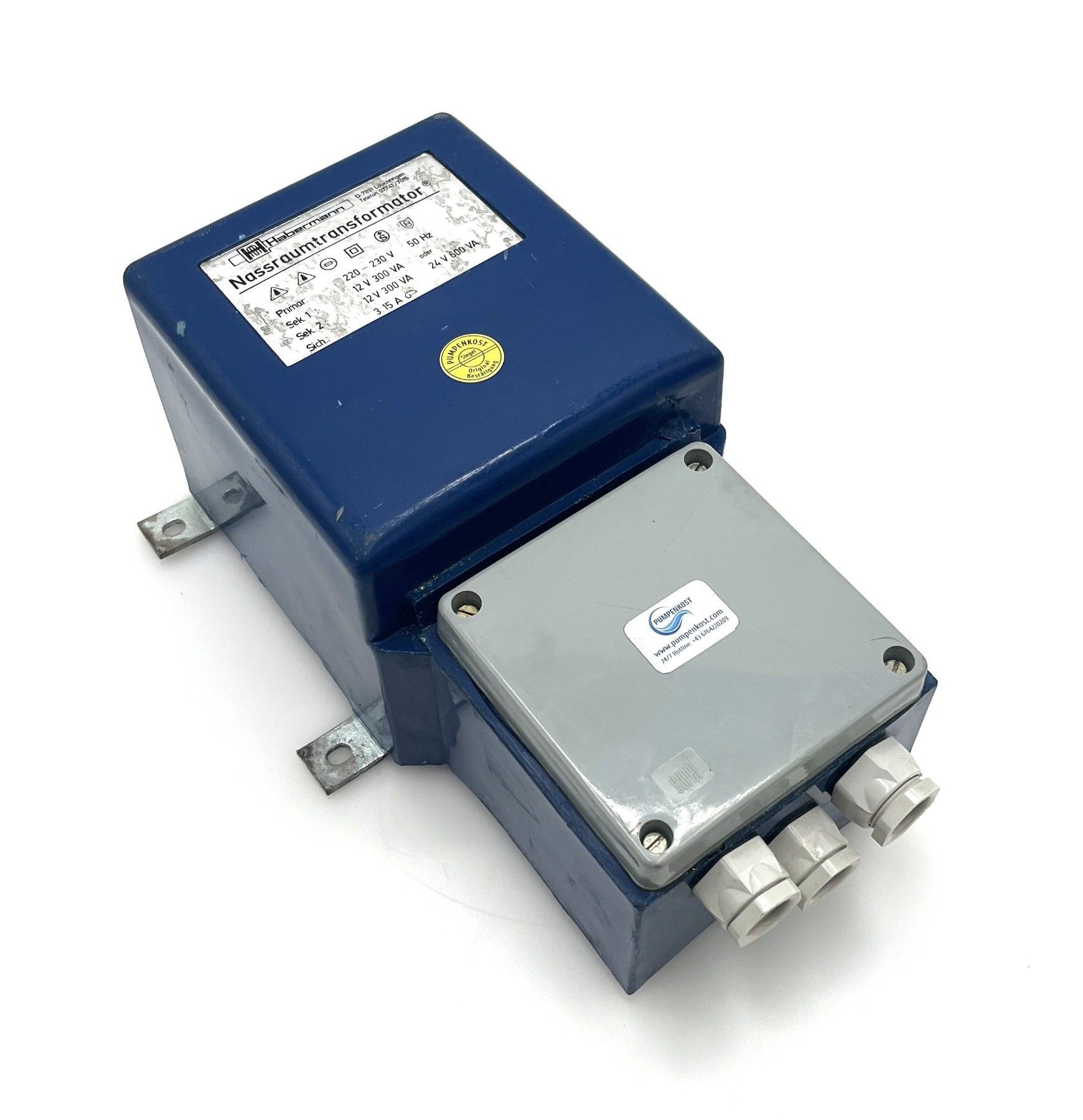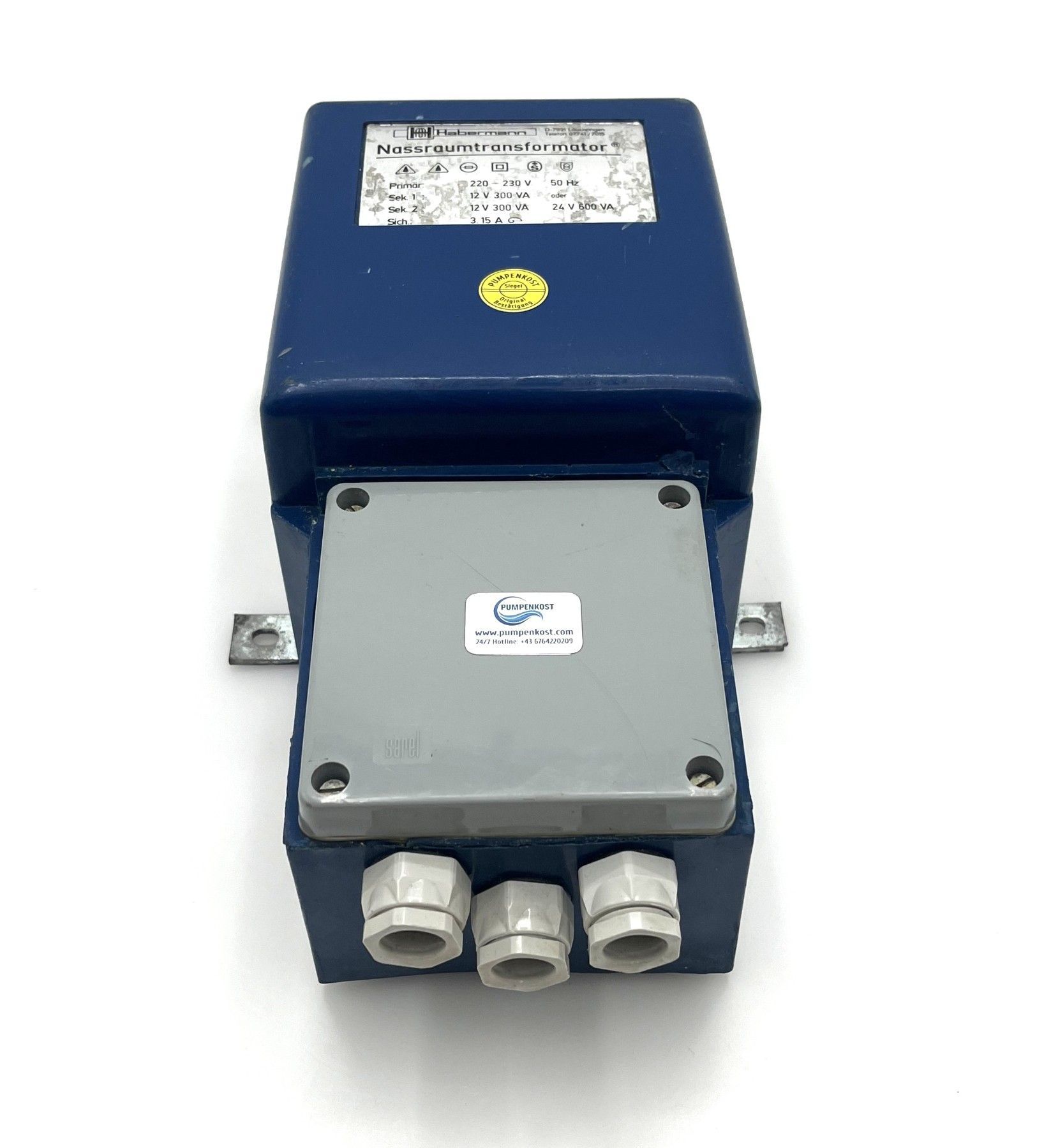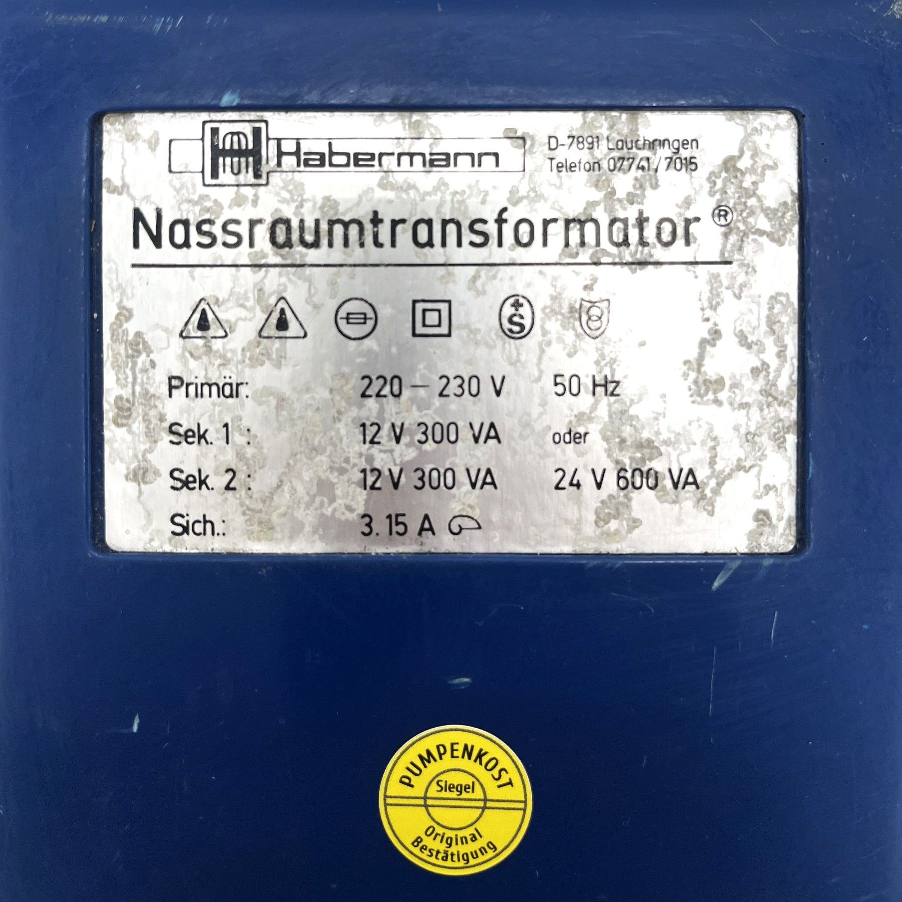 Habermann Nassraumtrafo Sicherheitstrenntrafo Gießharztransformator 300 600 VA pri. 220 - 230 V sec. 2 x 12 V a 300 VA Oder 24 V beide Wicklungen in Reihe 600 VA Maße L x B x H: 188 x 280 x 125 mm Gewicht: 9,9 kg Zustand: gebraucht (Top Zustand) Unsere Artikelnummer: T 9 1006 Sicherheitsprüfung nach