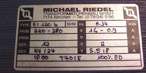 KOST-EX Elektrofachhandel Bestellnummer T10 238 Transformator Michael Riedel Primär 220 V (1,6 A) 380 V (0,9 A) Sekundär 12 V 2 A Sekundär 24 24 5,518 A 340 VA Gewicht: 5,14 kg Maße LxBxH: 120x98x107 mm nach VDE 0550 Sicherheits-, Funktionsprüfung und Isolationsmessung nach VDE durchgeführt Der Traf