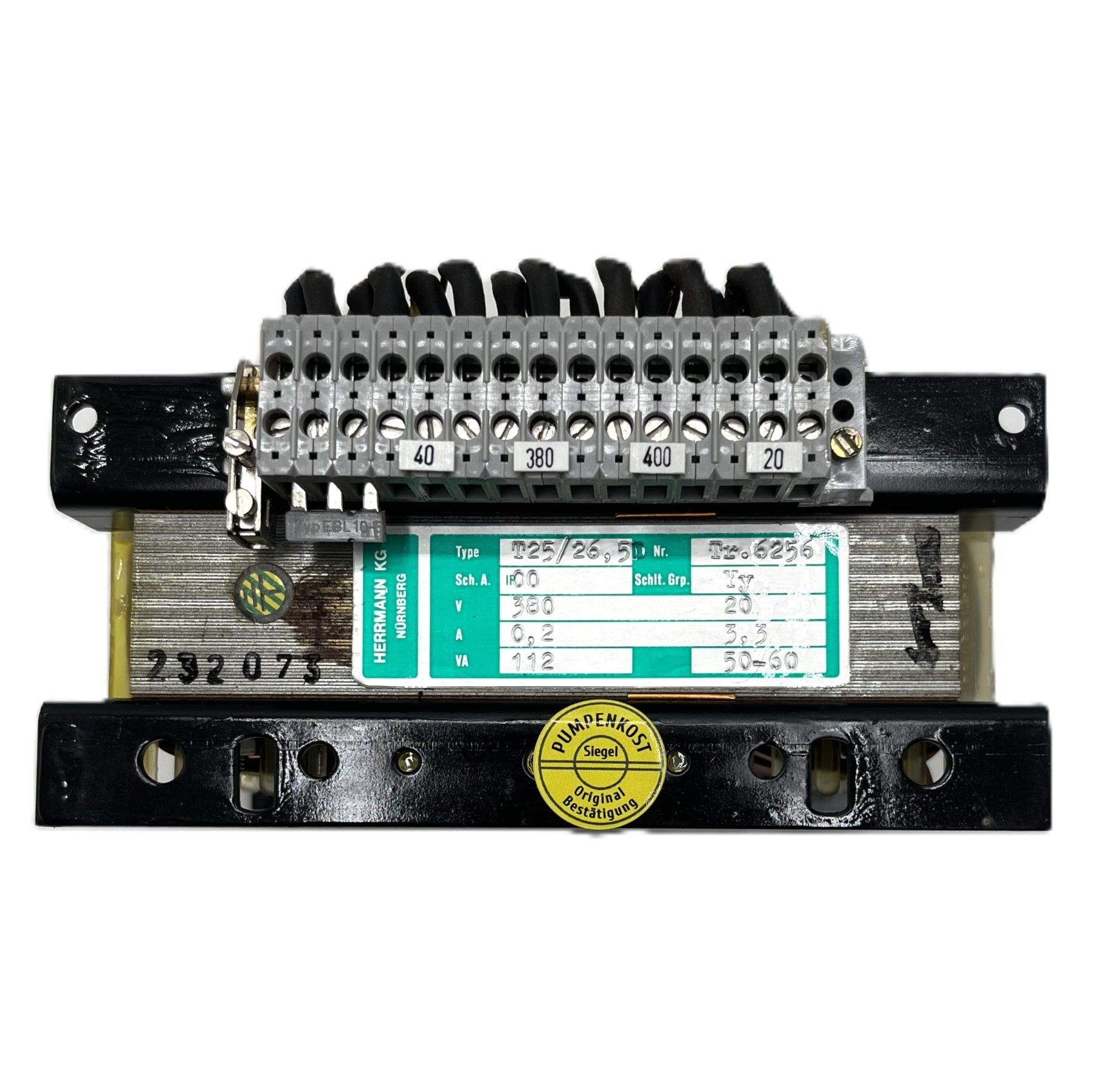 Herrmann KG Nürnberg Transformator T 25 26,5 D Trafo pri. 3 x 380 und 3 x 400 V sec. 3 x 20 V und 3 x 40 V Schaltgruppe: Yy 112 VA pri. 0,2 A sec. 3,3 A 50 - 60 Hz Maße L x B x H: 75 x 150 x 155 mm Gewicht: 3,8 kg Nr.: Tr. 6256 Sicherheitsprüfung nach VDE durchgeführt Zustand: gebraucht Unsere Artik