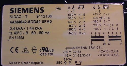 KOST-EX Elektrofachhandel Bestellnummer T9 389 Transformator Siemens Primär 208, 230, 380, 400, 415, 440, 460, 480, 500, 525, 550 V Sekundär 230 V (2,2 A) 115 V (4,4 A) 0,4 1,44 KVA Gewicht: 5,34 kg Maße LxBxH: 120x100x120 mm Sicherheits-, Funktionsprüfung und Isolationsmessung nach VDE durchgeführt... Mehr