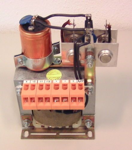 KOST-EX Elektrofachhandel Bestellnummer T9 471 Trafo EI 96 A 120 VA pri 220 V + - 5 % 0,56 A sec 24 V DC ( 5 A) Gleichstrom geglättet sec 4,5 V AC (1 A) Wechselstrom Gewicht: 2,64 kg Abmessungen: 100x75x150 mm Sicherheits-, Funktionsprüfung und Isolationsmessung nach VDE durchgeführt Der Trafo ist g
