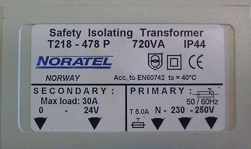 KOST-EX Elektrofachhandel Bestellnummer T9 406 Sicherheitstrenntransformator Typ T218-478P Primär 230 und 250 V Sekundär 24 V 30 A 720 VA Gewicht: 15,20 kg Maße LxBxH: 157x230x140 mm Sicherheits-, Funktionsprüfung und Isolationsmessung nach VDE durchgeführt Der Trafo ist neuwertig und war noch nie e