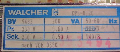 KOST-EX Elektrofachhandel Bestellnummer T10 250 Transformator Typ KT3 - 0,20 Primär 3x230 V 0,60 A Sekundär 3x230 V 0,50 A 200 VA Gewicht: 3,74 kg Maße LxBxH: 150x70x130 mm nach VDE 0550 Sicherheits-, Funktionsprüfung und Isolationsmessung nach VDE durchgeführt Der Trafo ist neuwertig und war noch n