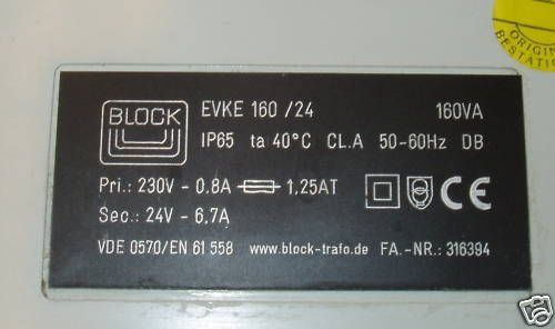 KOST-EX Elektrofachhandel Bestellnummer T10 7 Block Trafo EVKE 160 24 IP65 Prim. 230 V 0,8 A Sekundär: 24V 6,7 A 160 VA Gewicht: 4,88 kg Maße LxBxH: 150x153x115 mm nach VDE 0570 EN 61558 Sicherheits-, Funktionsprüfung und Isolationsmessung nach VDE durchgeführt Der Trafo ist gebraucht und in einem T