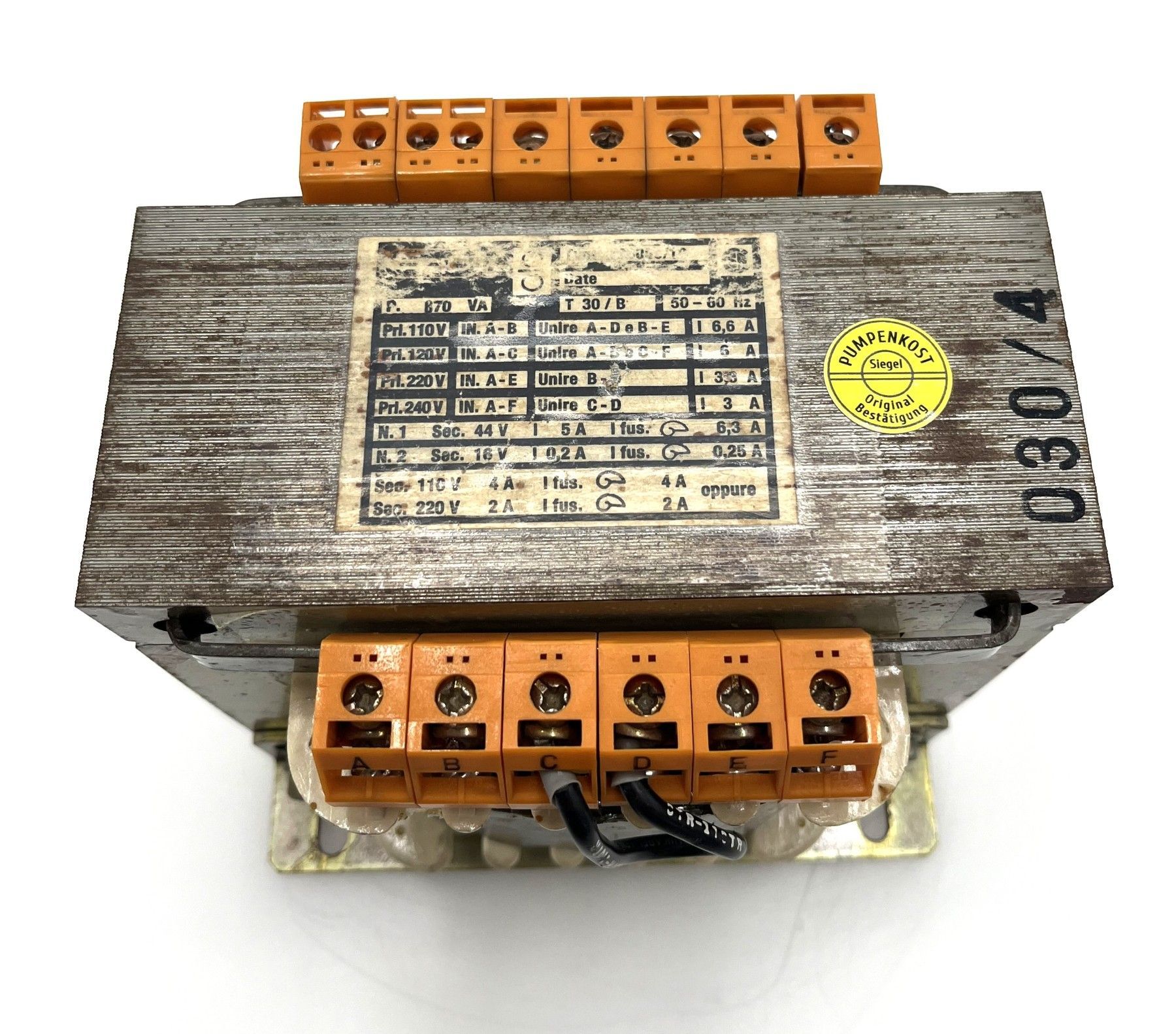 Transformator Trafo 670 VA pri. 110 V 6,6 A 120 V 6 A 220 V 3,3 A 240 V 3 A sec. 110 V 4 A 220 V 2 A 44 V 5 A 2 x 16 V 0,2 A Maße L x B x H: 125 x 150 x 130 mm Gewicht: 10,1 kg Zustand: gebraucht (Top Zustand) Unsere Artikelnummer: T9 1024