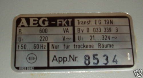 KOST-EX Elektrofachhandel Bestellnummer T10 79 Transformator AEG-FKT Transf. EG 19N Bv 0 033 339 3 App.Nr. 8534 Primär 220 V AC Sekundär 21 bis 32 V AC 600 VA Sicherung 4 A 50-60 Hz nur für trockene Räume Gewicht: 18,80 kg Maße LxBxH: 240x370x170 mm Dieses Netzgerät eignet sich sehr gut als 24 V - L