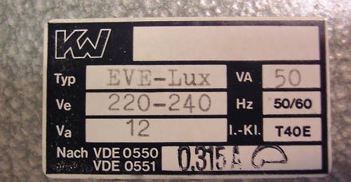 KOST-EX Elektrofachhandel Bestellnummer T9 338 Transformator EVE-Lux Primär 220-240 V Sekundär 12 V 50 VA Gewicht: 2,04 kg Maße LxBxH: 112x140x105 mm nach VDE 0551 abgesichert mit 0,315 A träge Sicherheits-, Funktionsprüfung und Isolationsmessung nach VDE durchgeführt Der Trafo ist gebraucht und in