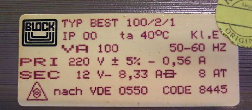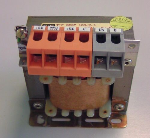 KOST-EX Elektrofachhandel Bestellnummer T9 357 Transformator Typ BEST 100 2 1 Primär 220 V +-5 % 0,56 A Sekundär 12 V 8,33 A 100 VA Gewicht: 1,90 kg Maße LxBxH: 85x78x95 mm nach VDE 0550 Sicherheits-, Funktionsprüfung und Isolationsmessung nach VDE durchgeführt Der Trafo ist gebraucht und in einem T