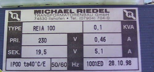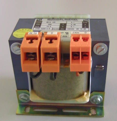 KOST-EX Elektrofachhandel Bestellnummer T9 392 Transformator der Fa. Riedel Illshofen Typ REIA 100 Primär 230 V 0,46 A Sekundär 19,5 V 5,1 A 0,1 kVA Gewicht: 2,06 kg Maße LxBxH: 85x75x85 mm nach VDE 0551 Sicherheits-, Funktionsprüfung und Isolationsmessung nach VDE durchgeführt Der Trafo ist neuwert