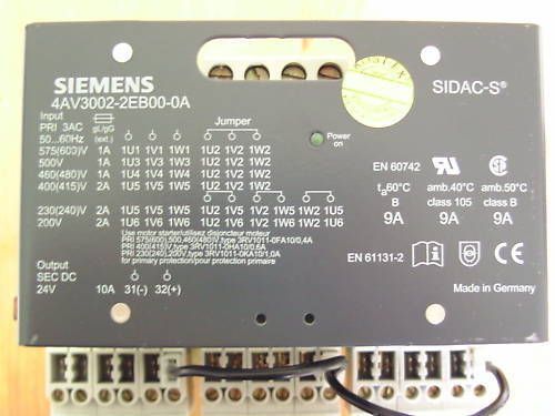 KOST-EX Elektrofachhandel Bestellnummer T9 442 Transformator Siemens SIDAC 4AV3002-2EB00-0A Prim. 200 V 2 A 230 (240) V 2 A 400 (415) V 2 A 460 (480) V 1 A 500 V 1 A 575 V 1 A Sekundär: 24 V DC 9 A Gewicht: 4,36 kg Maße LxBxH: 160x115x190 mm nach VDE Sicherheits-, Funktionsprüfung und Isolationsmess