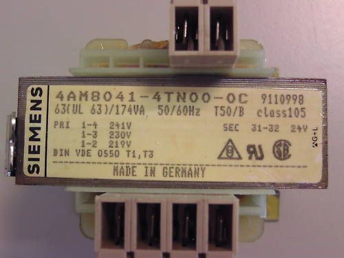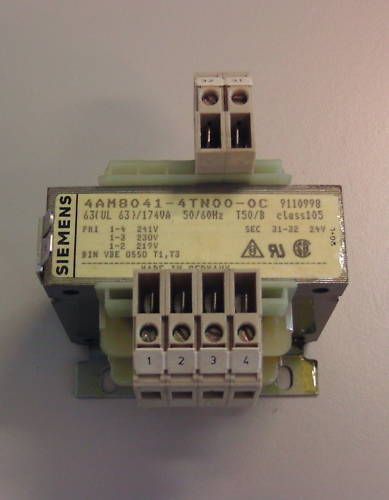 KOST-EX Elektrofachhandel Bestellnummer T9 223 Transformator Trafo Siemens 63 174 VA Primär 241 V, 230 V, 219 V Sekundär: 24 V Gewicht: 1,18 kg Maße LxBxH: 78x60x87 mm Sicherheits-, Funktionsprüfung und Isolationsmessung nach VDE durchgeführt VDE 0550 Der Trafo ist gebraucht und in einem Top-Zustand