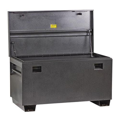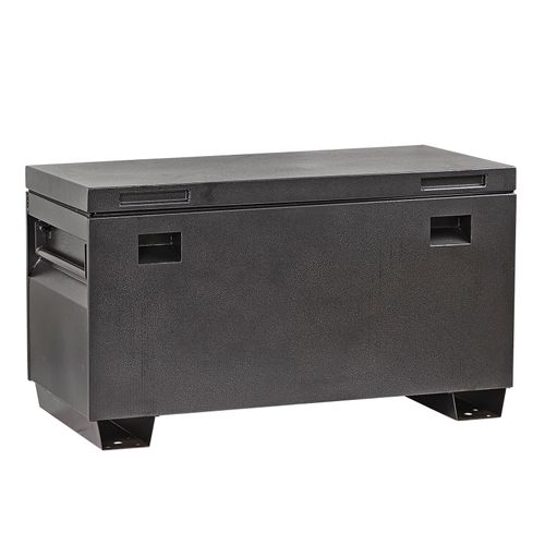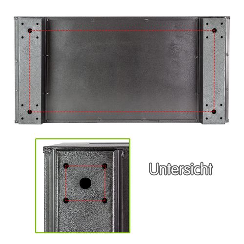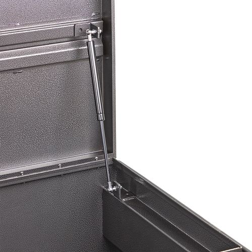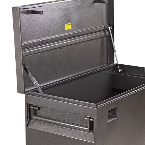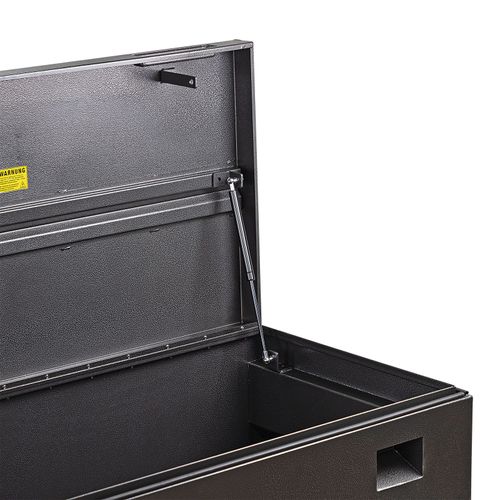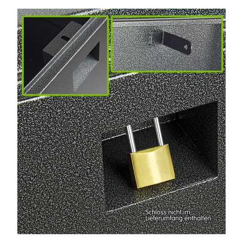 Werkzeugkiste GREY-XXL 420 Liter Werkzeugbox Metallbox Metallkiste Die DEMA Werkzeugkiste GREY-XXL bietet beeindruckende 420 Liter Stauraum und ist damit die ideale Lösung für die sichere und organisierte Aufbewahrung von Werkzeugen, Maschinen und anderen Ausstattungen. Mit ihrem edlen grau/anthrazitfarbenen Design passt sie sich perfekt in jede Werkstatt oder Lagerumgebung ein und bietet gleichzeitig eine hohe Funktionalität. Dank der stabilen Metallkonstruktion und der robusten, pulverbeschichteten Lackschicht ist diese Kiste besonders widerstandsfähig gegenüber Witterungseinflüssen und Spritzwasser. Der klappbare XXL Tragegriff auf beiden Seiten ermöglicht einen einfachen Transport, während die durchdachte Bauweise ohne vorstehende Kanten die Handhabung erleichtert. Der abschließbare Deckel (Vorhängeschloss nicht im Lieferumfang enthalten) sorgt dafür, dass Ihre Werkzeuge sicher verstaut sind. Produktmerkmale: Farbton: Grau / Anthrazit für eine zeitlose, elegante Optik.Material: Komplett aus robustem Metall gefertigt.XXL Tragegriff: Beidseitig klappbar für einfachen Transport.Sicheres Aufbewahren: Keine vorstehenden Kanten für mehr Sicherheit und eine bessere Handhabung.Pulverbeschichtete Lackierung: Schützt vor Spritzwasser und sorgt für eine langlebige Oberfläche.Abschließbar: Möglichkeit zur Abschließung mittels Vorhängeschloss (nicht im Lieferumfang enthalten).Deckelhalter: Mit Klappscharnier-Deckelhaltern für bequemes Öffnen.Verstärkter Deckel: Für zusätzliche Stabilität und Haltbarkeit.Staplergabelaufnahmen: Durchgehende Staplergabelaufnahmen ermöglichen eine einfache Handhabung durch Kranketten oder Schlupf. Technische Daten: Materialstärke: 2 mm (Metall), 3 mm (für Staplergabelaufnahmen).Innen-Nutzmaße: 120 x 60,5 x 58 cm (LxBxH).Nutzvolumen: 420 Liter.Außenmaße: 122 x 61 x 70 cm (LxBxH).Höhe aufgeklappt: 123 cm.Bohrmusterabstände:Große Bohrung (25 mm): 101,8 x 45,8 cm.Kleine Bohrung (12 mm): 8,4 x 8,4 cm.Gewicht: 60 kg. Hinweis: Das abgebildete Vorhängeschloss ist nicht im Lieferumfang enthalten. Diese robuste und großzügig dimensionierte Werkzeugkiste ist ideal für den Einsatz in Werkstätten, Garagen oder Betrieben, die eine zuverlässige Lösung zur Aufbewahrung und sicheren Verwahrung von Werkzeugen und Ausstattungen benötigen. Information für Speditionsartikel: Bitte teilen Sie uns Ihre Telefonnummer mit! Unsere Spedition benötigt für die Avisierung (d. h. die Spedition vereinbart einen Termin mit Ihnen zwecks Zustellung) eine Telefonnummer unter der Sie tagsüber zwischen 8 Uhr und 18 Uhr erreichbar sind. Laut unserem Angebot und unseren AGB´s: Speditionsware wird geliefert bis Bordsteinkante (Bordsteinkante bezieht sich dabei auf eine Form der Lieferung die nur den Weg und das Ausladen bis zur Bordsteinkante, beziehungsweise bis zum Bürgersteig der angegebenen Adresse abdeckt). Technische DatenMaterialstärke: 2 mmInnen-Nutzmaße LxBxH: 120x60,5x58 cmNutzvolumen: 420 LiterHöhe aufgeklappt: 123 cmBohrmusterabstände - große Bohrung (25 mm): 101,8x45,8 cmBohrmusterabstände - kleine Bohrung (12 mm): 8,4x8,4 cmStaplergabelaufnahmen-, Füße, Materialstärke ca. 3mm BxH: 12x8,5 cmAußenmaße LxBxH: 122x61x70 cmGewicht: 60 kg