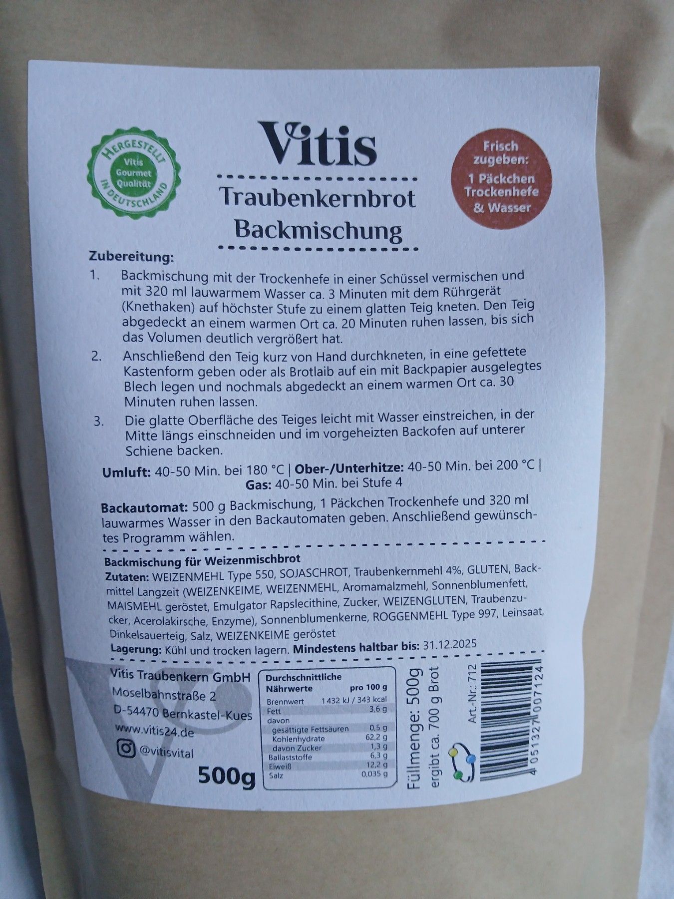 Traubenkernbrot - Backmischung 500 g Mit diesem hochwertigen Traubenkernmehl als Zutat, macht diese Backmischung komplett. Dieses Traubenkernmehl hat es auch schon ins Fernsehen geschafft. Alle Juroren waren sehr begeistert und wurde auch sehr gelobt. Inhalt: · 500 gr. Geschmack: · Ker