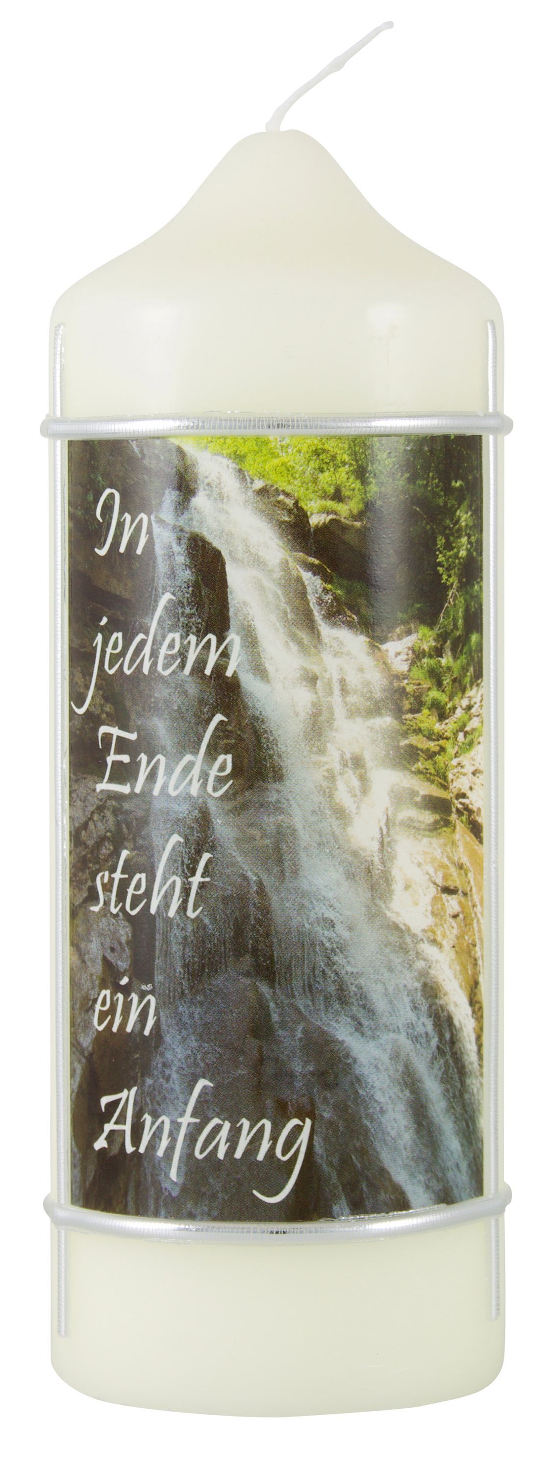 schön gestaltete Motivkerze mit Text: In jedem Ende steht ein Anfang Details zum Produkt: Größe: 16,5 x 6cm Material: Wachs